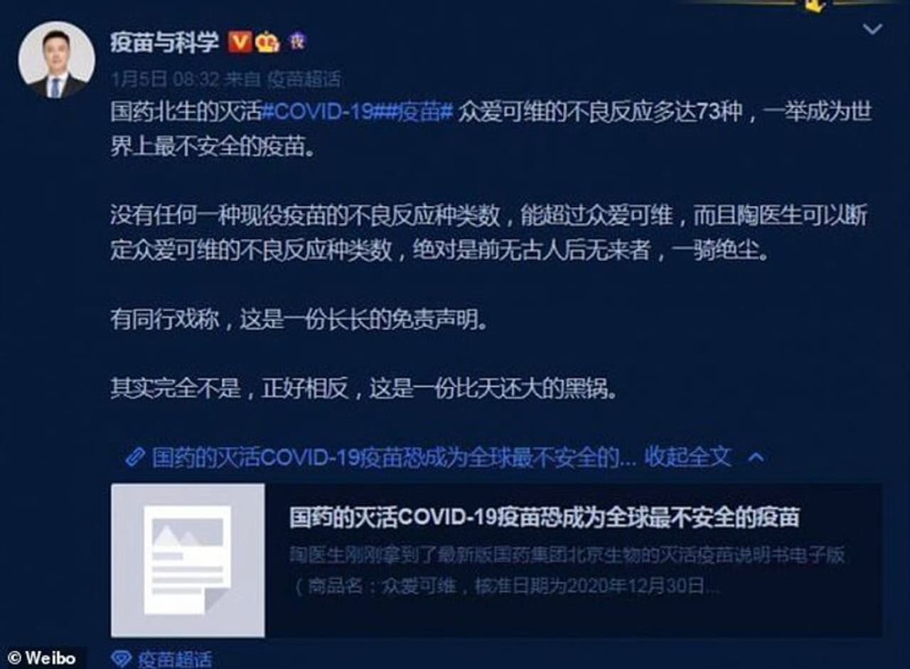 চিনা সোশ্য়াল মিডিয়া ওয়েইবো-তে করা একটি পোস্টে ডাক্তার তাও লিনা জানিয়েছিলেন, সিনোফার্ম কোভিড-১৯ ভ্যাকসিন দিলে, ইনজেকশন দেওয়ার জায়গার চারপাশে ব্যথা, মাথাব্যথা, উচ্চ রক্তচাপ, দৃষ্টিশক্তি এবং স্বাদানুভূতি হ্রাস এবং মূত্রত্যাগের অসংলগ্নতা-র মতো ৭৩টি গুরুতর পার্শ্ব প্রতিক্রিয়া দেখা দিতে পারে। তবে তাঁর এই পোস্ট চিনে ভাইরাল হতেই ওই ভ্যাকসিন বিশেষজ্ঞ তাঁর 'অনর্থক' মন্তব্যের জন্য দেশ, তাঁর সহকর্মী এবং দেশবাসীর কাছে ক্ষমা চেয়েছেন। চিনের সরকারি সংবাদমাধ্যম 'গ্লোবাল টাইমস'কে তিনি বলেছেন, তিনি কখনই বলেননি যে 'নিষ্ক্রিয় ভ্যাকসিন'গুলির সুরক্ষা এবং কার্যকারিতা নেই। বরং চিনে তৈরি নিষ্ক্রিয় ভ্যাকসিনগুলি সম্পর্কে জনসাধারণের উদ্বেগকে উড়িয়ে দিতে একাধিক নিবন্ধে তিনি চিনা ভ্যাকসিন নিরাপদ বলে জানিয়েছেন।