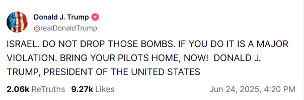 ট্রাম্প আরও বলেছেন, ইজরায়েল ইরান আক্রমণ করবে না এবং যুদ্ধবিরতি কার্যকর রয়েছে। "ইজরায়েল ইরান আক্রমণ করবে না। সমস্ত বিমান ঘুরে যাবে এবং বাড়ি ফিরে যাবে, ইরানের প্রতি একটি বন্ধুত্বপূর্ণ 'বিমান তরঙ্গ' করার সময়। কেউ আহত হবে না, যুদ্ধবিরতি কার্যকর রয়েছে! এই বিষয়ে আপনার মনোযোগের জন্য ধন্যবাদ! ডোনাল্ড জে. ট্রাম্প, মার্কিন যুক্তরাষ্ট্রের রাষ্ট্রপতি।"