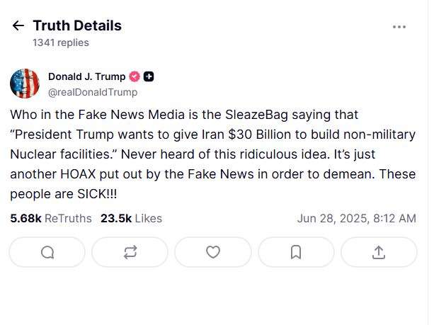 মার্কিন প্রেসিডেন্ট ডোনাল্ড ট্রাম্প তার প্রশাসন ইরানের সঙ্গে বেসামরিক পারমাণবিক সুবিধা বিকাশে ৩০ বিলিয়ন মার্কিন ডলারের চুক্তি বিবেচনা করছে। একাধিক মিডিয়া রিপোর্টে এমনটাই দাবি করা হয়েছে। যদিও এই প্রতিবেদনগুলি সত্য নয় বলেও দাবি করেছেন মার্কিন প্রেসিডেন্ট ডোনাল্ড ট্রাম্প। ট্রুথ সোশ্যালে একটি পোস্টে, ট্রাম্প লিখেছেন, "ভুয়া সংবাদমাধ্যমের কোন স্লিজব্যাগ বলছে যে "রাষ্ট্রপতি ট্রাম্প ইরানকে অ-সামরিক পারমাণবিক সুবিধা নির্মাণের জন্য ৩০ বিলিয়ন ডলার দিতে চান।" এই হাস্যকর ধারণাটি কখনও শুনিনি। এটি কেবল ভুয়া সংবাদমাধ্যমের দ্বারা প্রচারিত আরেকটি মিথ্যাচার। এই লোকেরা অসুস্থ!!!"