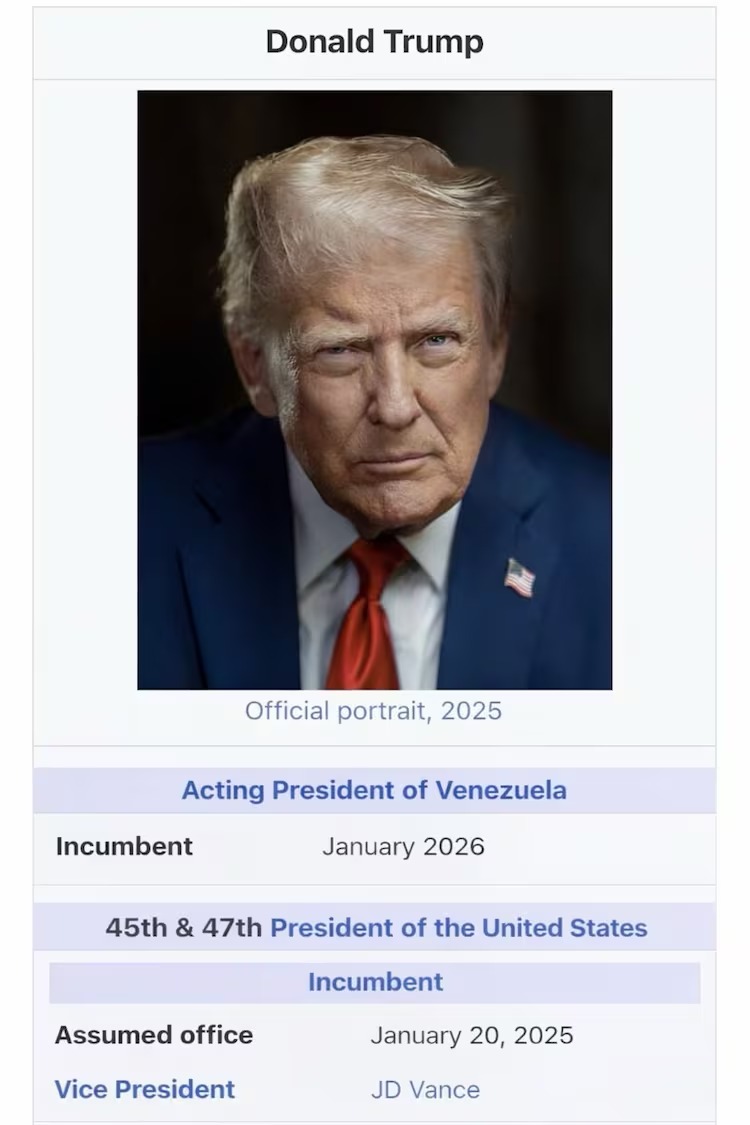 অনলাইনে এই ঘোষণা সত্ত্বেও উইকিপিডিয়া বা অন্যান্য বহুল ব্যবহৃত পাবলিক রেকর্ডে ট্রাম্পকে ভেনেজুয়েলার ভারপ্রাপ্ত প্রেসিডেন্ট হিসেবে তালিকাভুক্ত করা হয়নি। এর পরিবর্তে যা নথিভুক্ত আছে তা হল মার্কিন সামরিক অভিযান, মাদুরোর গ্রেফতার এবং কারাকাসে বর্তমানে প্রতিষ্ঠিত বিতর্কিত অন্তর্বর্তী নেতৃত্ব।