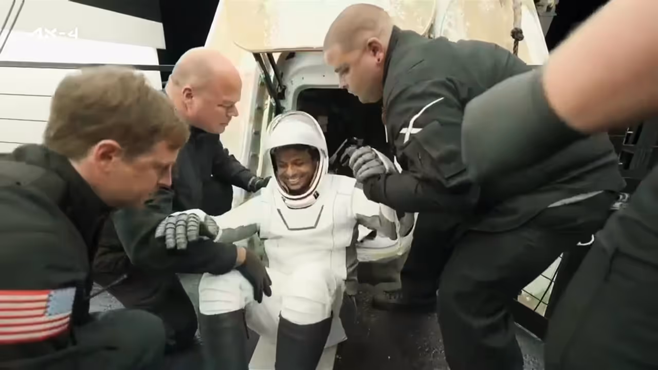 ড্রাগনের ক্যাপসুল খুলে তাতে থাকা মহাকাশচারীদের বাইরে বের করা হয়। শুভাংশু শুক্লা বের হওয়ার সময় দ্বিতীয় নম্বরে ছিলেন। তিনি ১৮ দিন মহাকাশে ছিলেন। এই সময়কালে সূক্ষ্ম মাধ্যাকর্ষণ শক্তি অনুভব করেছেন। যান থেকে বের হওয়ার পর ১৮ দিন পর আবার নিজের ওজন অনুভব করেন। চারজনের সাহায্যে তিনি মাটিতে পা রাখেন।