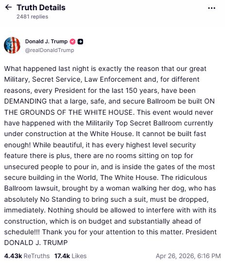 তিনি বলেন, "গত রাতে যা ঘটেছে, ঠিক সেই কারণেই আমাদের মহান মিলিটারি, সিক্রেট সার্ভিস, আইন প্রয়োগকারী সংস্থা এবং গত ১৫০ বছর ধরে প্রত্যেক প্রেসিডেন্ট হোয়াইট হাউসের চত্বরে একটি বড়, নিরাপদ ও সুরক্ষিত বলরুম তৈরির দাবি জানিয়ে আসছেন। হোয়াইট হাউসে যে ‘মিলিটারি টপ সিক্রেট বলরুম’ তৈরি হচ্ছে, সেখানে এই অনুষ্ঠান হলে এমনটা কখনওই ঘটত না। এটা যত তাড়াতাড়ি সম্ভব তৈরি হওয়া দরকার! এটি সুন্দর তো বটেই, এর মধ্যে সর্বোচ্চ স্তরের সমস্ত নিরাপত্তা ব্যবস্থা রয়েছে। তাছাড়া, এর ওপরে কোনও ঘর নেই যেখান থেকে বিনা বাধায় সাধারণ লোকেরা ঢুকে পড়তে পারে। আর এটি বিশ্বের সবচেয়ে সুরক্ষিত ভবন হোয়াইট হাউসের গেটের ভেতরে অবস্থিত। কুকুর নিয়ে হাঁটা এক মহিলার দায়ের করা এই হাস্যকর বলরুম মামলাটি অবিলম্বে প্রত্যাহার করা উচিত। ওই মহিলার এই ধরনের মামলা করার কোনও অধিকারই নেই। এর নির্মাণে কোনও কিছুই বাধা সৃষ্টি করতে পারবে না। এর বাজেট ঠিক আছে এবং নির্ধারিত সময়ের চেয়ে অনেকটাই এগিয়ে কাজ চলছে!!! এই বিষয়ে মনোযোগ দেওয়ার জন্য ধন্যবাদ। প্রেসিডেন্ট ডোনাল্ড জে. ট্রাম্প।"