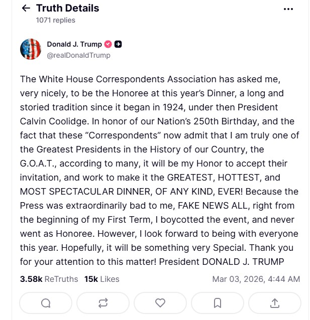 ট্রাম্প লেখেন, "হোয়াইট হাউস করেসপন্ডেন্টস অ্যাসোসিয়েশন খুব সুন্দরভাবে আমাকে এই বছরের ডিনারের প্রধান অতিথি হতে বলেছে... আমাদের দেশের ২৫০তম জন্মদিন এবং এই 'সাংবাদিকরা' এখন স্বীকার করে যে আমি সত্যিই আমাদের দেশের ইতিহাসের অন্যতম সেরা প্রেসিডেন্ট, অনেকের মতে G.O.A.T., তাই এই আমন্ত্রণ গ্রহণ করা আমার জন্য সম্মানের।"