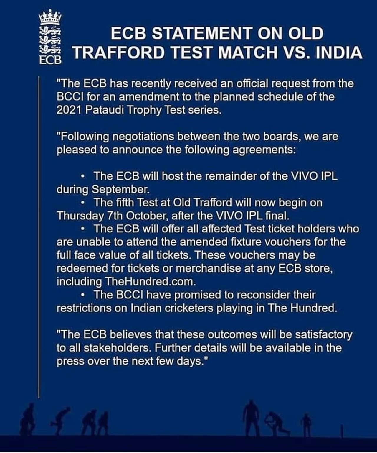 ভাইরাল পোস্টটিতে আরও বলা হয়েছে, ইসিবির শর্তগুলি মেনে নিয়েছে বিসিসিআই। আইপিএল-এর বাকি অংশ আয়োজন করা ছাড়াও ওই পোস্ট অনুযায়ী ইসিবি আরও শর্ত দিয়েছে, সেপ্টেম্বর মাসে ভিভো আইপিএল-এর ফাইনালের পরই অক্টোবরে ওল্ড ট্র্যাফোর্ড স্টেডিয়ামে পাঁচ টেস্টের পতৌদি ট্রফির পঞ্চম টেস্ট খেলা হবে। এছাড়া ইংল্যান্ড এবং ওয়েলসব্যাপী 'দ্য হ্যান্ড্রেড' নামে যে ১০০ বলের ফ্র্যাঞ্চাইজি ক্রিকেট টুর্নামেন্ট আয়োজিত হবে, সেখানে ভারতীয় খেলোয়াড়দের অংশ নেওয়া নিয়েও ভারতীয় বোর্ডের কাছে আপত্তি জানিয়েছে ইসিবি।