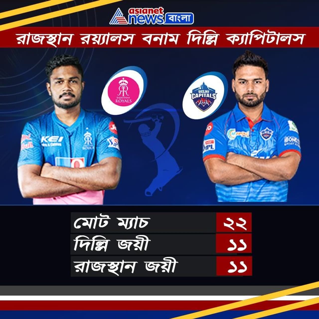 আইপিএলে দুই দলের পরিসংখ্যান দেখলেই বোঝা যায় যে একে অপরকে সমানে সমানে টক্কর দিয়েছে। আইপিএলের ইতিহাসে এখনও পর্যন্ত মোট ২২ বার মুখোমুখি হয়েছে রাজস্থান রয়্যালস ও দিল্লি ক্য়াপিটালস। ১১ বার জিতেছে বর্তমান অধিনায়র শ্রেয়সস আইয়েরের দিল্লি ও ১১ বার জিতেছে বর্তমান অধিনায়ক সঞ্জু স্যামসনের রাজস্থান রয়্যালস। আজকের ম্যাচে একে অপরকে টপকে যাওয়ার সুযোগ থাকছে দুই দলের কাছে।