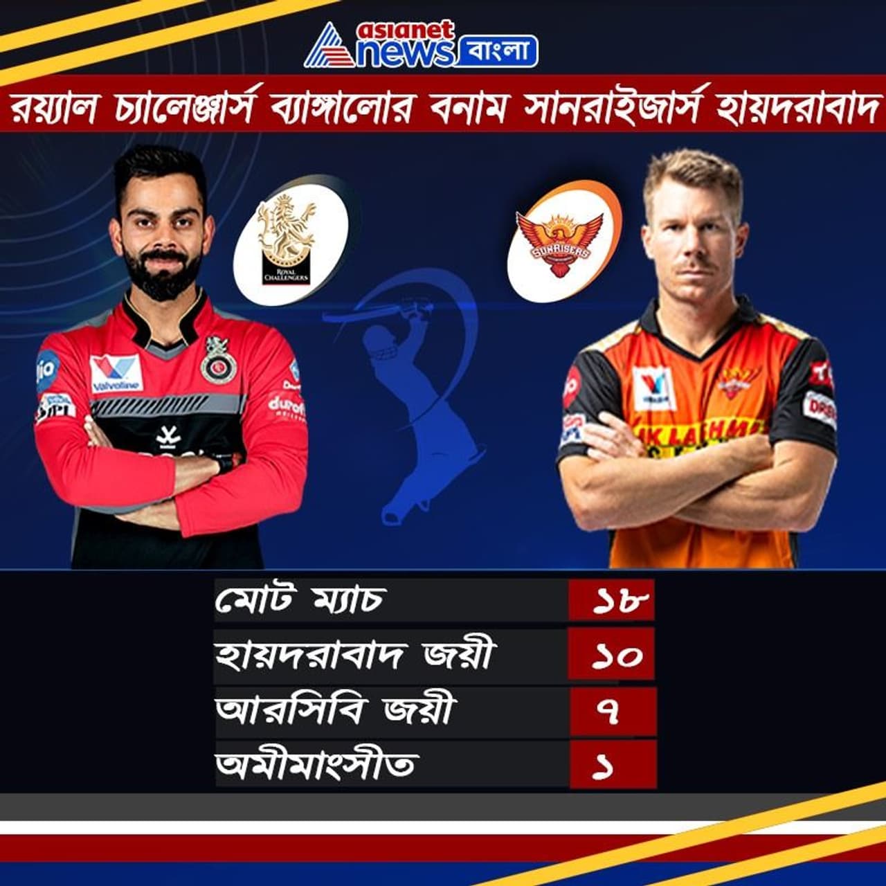 মুখোমুখি সাক্ষাতের পরিসংখ্যানে কিন্তু রয়্যাল চ্যালেঞ্জার্স ব্যাঙ্গালোরের থেকে কিছুটা এগিয়ে সানরাইজার্স হায়দরাবাদ। আইপিএলের ইতিহাসে এখনও পর্যন্ত ১৮ বার দুই দল মুখোমুখি হয়েছে। তার মধ্যে ১০ বার জিতেছে ডেভিড ওয়ার্নারের দল, আর ৭ বার জিতেছে বিরাট কোহলির দল। একটি ম্যাচ অমীমাংসীত। এবার ব্যবধান কমাতে মরিয়া আরসিবি ও ব্যবধান বাড়াতে বদ্ধপরিকর এসএরএইচ।