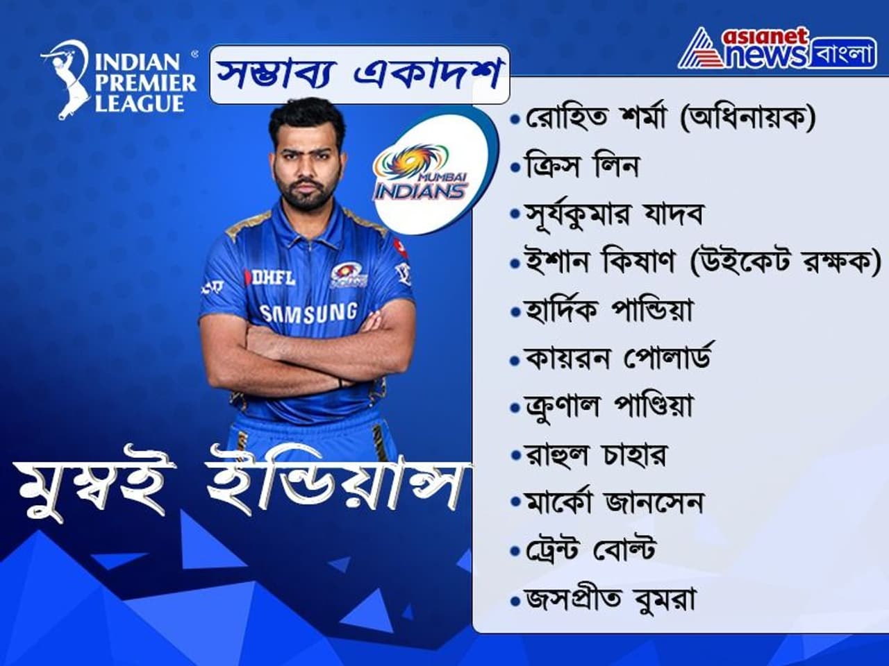 অপরদিকে মুম্বই ইন্ডিয়ান্স সূত্রে যা খবর পাওয়া যাচ্ছে তাতে প্রথম ম্যাচের একাদশই ধরে রাখতে চলেছে রোহিত শর্মার দল। ব্যাটিং লাইনআপে থাকছেন রোহিত শর্মা (অধিনায়ক), ক্রিস লিন, সূর্যকুমার যাদব, ইশান কিষাণ (উইকেট রক্ষক),হার্দিক পান্ডিয়া। অলরাউন্ডারের ভূমিকায় থাকছেন কায়রন পোলার্ড, ক্রুণাল পাণ্ডিয়া। বোলিং লাইনআপে থাকছেন রাহুল চাহার, মার্কো জানসেন, ট্রেন্ট বোল্ট, জসপ্রীত বুমরা।