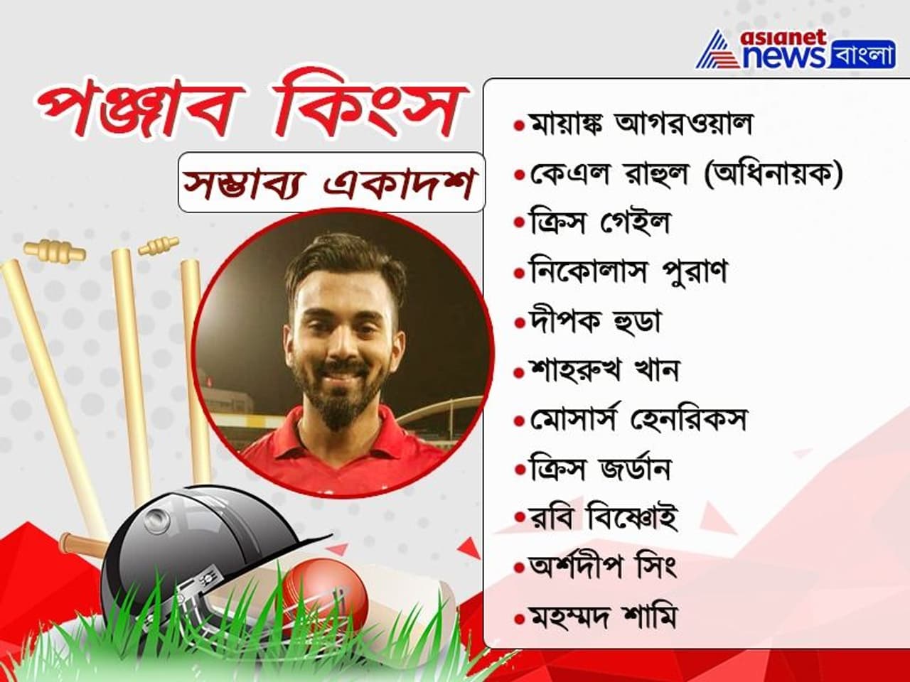 কেকেআরের বিরুদ্ধে শেষ ম্যাচ হারলেও, প্রথম একাদশে খুব একটা পরিবর্তনেপ সম্ভাবনা নেই পঞ্জাব কিংস দলে। গত ম্যাচের দলই নামাতে চলেছে পঞ্জাব টিম ম্যানেজমেন্ট। সেক্ষেত্রে পঞ্জাব কিংসের ব্যাটিং লাইনআপে থাকছেন মায়াঙ্ক আগরওয়াল, কেএল রাহুল (অধিনায়ক ও উইকেট রক্ষক), ক্রিস গেইল, নিকোলাস পুরাণ। দলে অলরাউন্ডারের ভূমিকায় থাকছেন দীপক হুডা, শাহরুখ খান, মোসার্স হেনরিকস। বোলিং লাইনআপে থাকছেন ক্রিস জর্ডান, রবি বিষ্ণোই, অর্শদীপ সিং, মহম্মদ শামি।