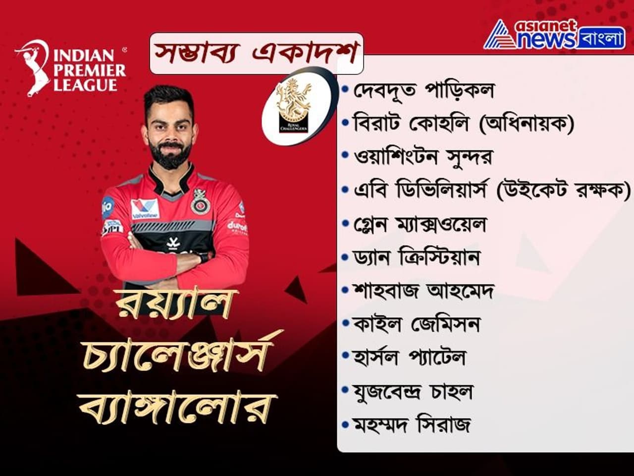 প্রথম ম্য়াচে কোভিড হওয়ার কারণে দলে ছিলেন দেবদূত পাড়িকল। যার ফলে ওয়াশিংটন সুন্দরকে নিয়ে ওপেনিং করেছিলেন বিরাট কোহলি। তবে আজকের ম্য়াচে দলে ফেরার সম্ভাবনা প্রবল পাড়িকলের। যার ফলে বিরাট ও পাড়িকল সামলাবেন ওপেনিংয়ের দায়িত্ব। আরসিবির প্রথম এককাদশে থাকছেন, ওপেনিংয়ে দেবদূত পাড়িকল, বিরাট কোহলি (অধিনায়ক)। মিডল অর্ডারে থাকছেন এবি ডিভিলিয়ার্স (উইকেট রক্ষক), গ্লেন ম্যাক্সওয়েল শাহবাজ আহমেদ। অলরাউন্ডারের ভূমিকায় থাকছেন ওয়াশিংটন সুন্দর ও ড্যান ক্রিস্টিয়ান। বোলিং লাইনআপে থাকছেন কাইল জেমিসন, হার্সল প্যাটেল, যুজবেন্দ্র চাহল, মহম্মদ সিরাজ।