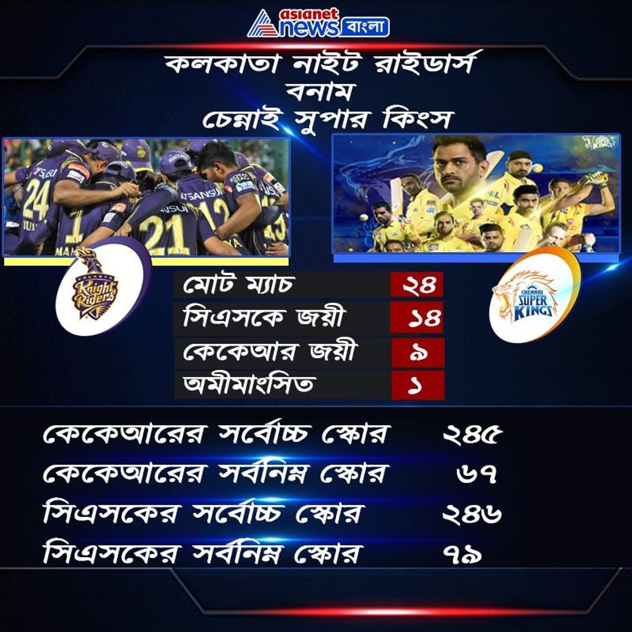 দুদলের মুখোমুখি সাক্ষাতের পরিসংখ্যানে কিন্তু অনেকটাই এগিয়ে চেন্নাই সুপার কিংস। এখনও পর্যন্ত আইপিএলের ইতিহাসে মোট ২৪ বার মুখোমুখি হয়েছে দুই দল। চেন্নাই সুপার কিংস জিতেছে ১৪ বার, কলকাতা নাইট রাইডার্স জিতেছে ৯ বার ও একটি ম্যাচ অমীমাংসিত। তবে এবারের আইপিএলে একেবারে নিজেদের সেরা ফর্মে নেই চেন্নাই। তাই আজকের ম্যাচে কেকেআরকেই এগিয়ে রাখছেন ক্রিকেট বিশেষজ্ঞরা।