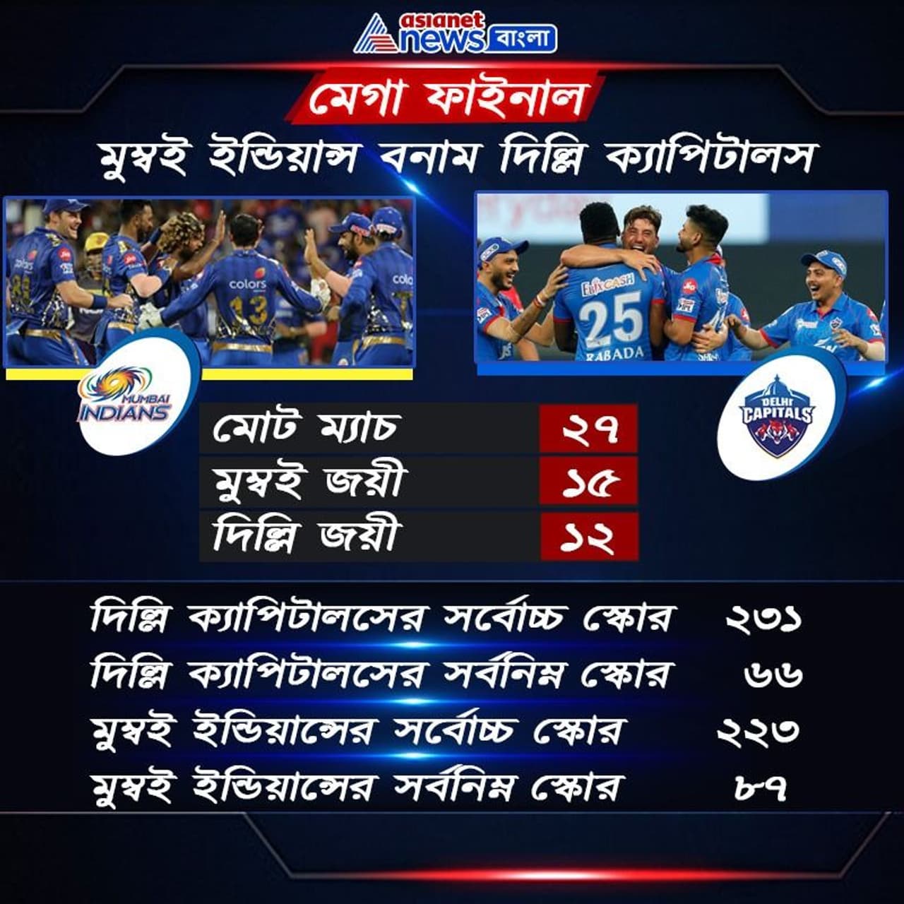 শুধু শক্তিতেই নয়, দুই দলের মুখোমুখি সাক্ষাতের পরিসংখ্যানেও এগিয়ে মুম্বই ইন্ডিয়ান্স। এখনও পর্যন্ত আইপিএলের ইতিহাসে মোট ২৭ বার মুখোমুখি হয়েছে দুই দল। মুম্বই ইন্ডিয়ান্স জিতেছে ১৫ বার ও দিল্লি ক্যাপিটালস জিতেছে ১২ বার। এবারও ক্রিকেট বিশেষজ্ঞরা আইপিএল ২০২০-র মেগা ফাইনালে এগিয়ে রাখছেন রোহিত শর্মার দলকে।