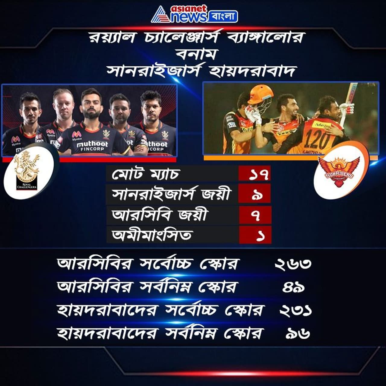 দুদলের মুখোমুখি সাক্ষাতের পরিসংখ্যানে কিন্তু কিছুটা এগিয়ে সানরাইজার্স হায়দরাবাদ। এখনও পর্যন্ত আইপিএলের ইতিহাসে মোট ১৭ বার মুখোমুখি হয়েছে দুই দল। তার মধ্যে ৯ বার জিতেছে সানরাইজার্স হায়দরাবাদ ও ৭ বার জিতেছে রয়্যাল চ্যালেঞ্জার্স ব্যাঙ্গালোর। একটি ম্যাচ অমীমাংসিত।
