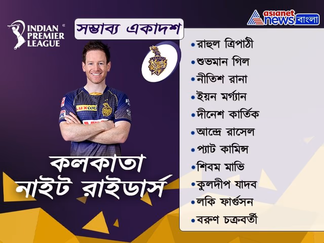 আজ আইপিএলের গুরুত্বপূর্ণ ম্যাচে মুখোমুখি কলকাতা নাইট রাইডার্স ও রয়্যাল চ্যালেঞ্জার্স ব্যাঙ্গালোর। আবুধাবিতে আজকের ম্যাচ জিতে শেষ চারে জায়গা পাকা করতে আরও এক ধাপ এগোতে মরিয়া কেকেআর অধিনাক ইয়ন মর্গ্যান ও আরসিবি অধিনায়ক বিরাট কোহলি। দুই দলের সম্ভাব্য একাদশ নিয়েও চলছে নানা জল্পনা। আজকের ম্যাচে কেকেআার দলে পরিবর্তন হওয়ার সম্ভাবনা খুবই কম। ব্যাটিং লাইনআপে থাকছেন রাহুল ত্রিপাঠী, শুভমান গিল, নীতিশ রানা, ইয়ন মর্গ্যান, দীনেশ কার্তিক, আন্দ্রে রাসেল, প্যাট কামিন্স। অন্যান্য ব্যাটসম্যানরা কমবেশি রান করলেও, রাসেলের টানা অফ ফর্ম নিয়ে চিন্তায় রয়েছে কেকেআর। অপরদিকে বোলিং লাইনআপে রয়েছেন কুলদীপ যাদব, বরুণ চক্রবর্তী, শিবম মাভি, প্যাট কামিন্স, লকি ফার্গুসন। বিশেষ করে সানরাইজার্সের বিরুদ্ধে ফার্গুসনের আগুনে বোলিং বাড়তি ভরসা দিয়েছে কেকেআরকে।