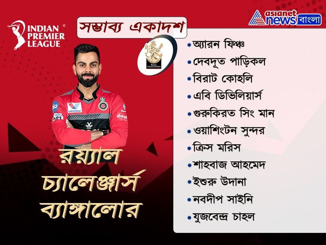 অপরদিকে, অন্যান্যবারের থেকে দুরন্ত ফর্মে রয়েছে রয়্যাল চ্যালেঞ্জার্স ব্যাঙ্গালোর। এখনও পর্যন্ত যা খবর, তাতে অপরবর্তিত থাকতে চলেছে আরসিবি দল। দলের ওপেনিংয়ের দায়িত্ব সামলাবেন অ্যারন ফিঞ্চ, দেবদূত পাড়িকল। মিডল অর্ডারে থাকছে দলের দুই সেরা তারকা বিরাট কোহলি, এবি ডিভিলিয়ার্স। এছাড়াও থাকছেন গুরুকিরাত সিং মান। অলরাউন্ডারের দায়িত্ব পালন করছেন ওয়াশিংটন সুন্দর ও ক্রিস মরিস। বিশেষ করে ক্রিস মরিসের দুর্নত বোলিং পারফরমেন্স বাড়তি ভরসা দিচ্ছে আরসিবিকে। বোলিং লাইনআপে দলকে ভরসা দিচ্ছেন ইশুরু উদানা, নবদীপ সাইনি, শাহবাজ আহমেদ, যুজবেন্দ্র চাহল। স্পিন অ্যাটাকে দুরন্ত ছন্দে রয়েছেন চাহল- সুন্দর জুটি। ফলে আজ কেকেআরের বিরুদ্ধে জয়ের বিষয়ে আত্মবিশ্বাসী বিরাট ব্রিগেড।
