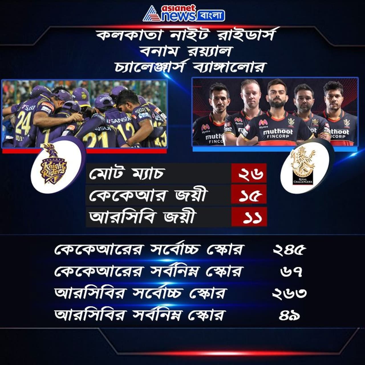 দুই দলের মুখোমুখি সাক্ষাতে কিন্তু কিছুটা এগিয়ে রয়েছে কলকাতা নাইট রাইডার্স। এখনও পর্যন্ত আইপিএলের ইতিহাসে মোট ২৬ বার মুখোমুখি হয়েছে দুই দল। তারমধ্যে ১৫ বার জিতেছে ইয়ন মর্গ্যানের দল ও ১১ বার জিতেছে বিরাট কোহলির দল। তবে এবার আইপিএলে দুরন্ত ফর্মে রয়েছে আরসিবি। ভাল ক্রিকেট খেলছে কেকেআরও। ফলে আজ আবুধাবিতে আরও একটি রুদ্ধশ্বাস ম্যাচ দেখার অপেক্ষায় ক্রিকেট প্রেমিরা।