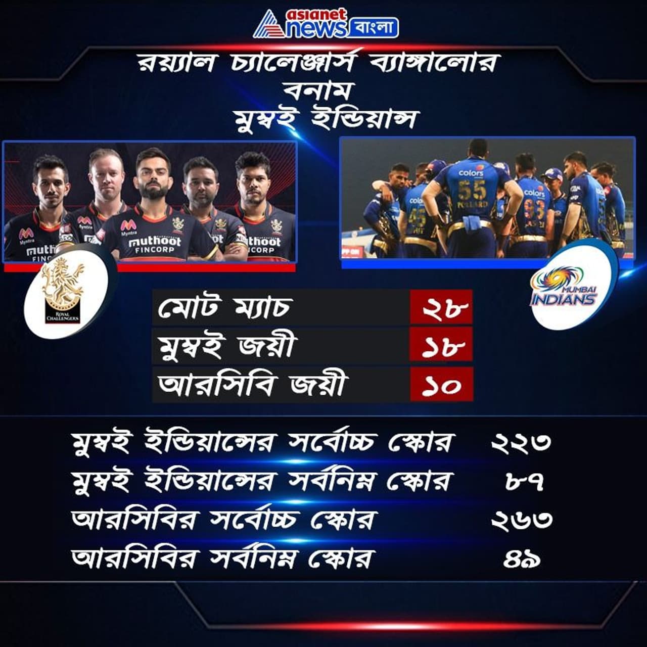 দুই দলের মুখোমুখি সাক্ষাতের পরিসংখ্যানে কিন্তু অনেকটাই এগিয়ে মুম্বই ইন্ডিয়ান্স। এখনও পর্যন্ত আইপিএলের ইতিহাসে মোট ২৮ বার মুখোমুখি হয়েছে দুই দল। মুম্বই ইন্ডিয়ান্স জিতেছে ১৮ বার ও ১০ বার জিতেছে রয়্যালল চ্যালেঞ্জার্স ব্যাঙ্গালোর। তবে এবারের আইপিএলে দুরন্ত ফর্মে রয়েছে দুই দল। শক্তির বিচারে মুম্বই কিছুটা এগিয়ে থাকলেও, আরও একটি রুদ্ধশ্বাস ম্যাচ দেখার অপেক্ষায় ক্রিকেট বিশ্ব।