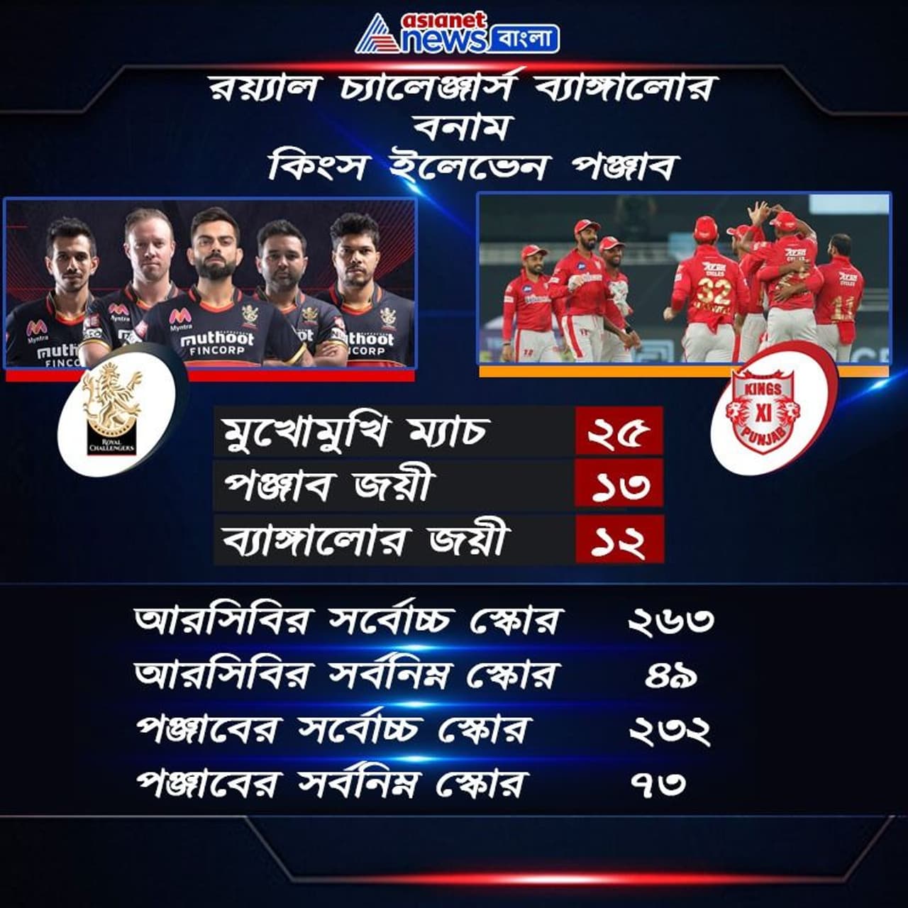দুই দলের মুখোমুখি সাক্ষাৎ কিন্তু হাড্ডাহাড্ডি লড়াইয়ের ইঙ্গিত দিচ্ছে।কারণ এখনও পর্যন্ত অইপিএলের ইতিহাসে মোট ২৫ বার সাক্ষাৎ হয়েছে দুই দলের। তার মধ্যে কিংস ইলেভেন পঞ্জাব জয়ী হয়েছে ১৩টি ম্যাচে ও রয়্যাল চ্যালেঞ্জার্স ব্যাঙ্গালোর জয়ী হয়েছে ১২টি ম্যাচে। তবে এবারের আইপিএলে দুই দলের সাম্প্রতিক ফর্মের বিচার করলে অনকটাই এগিয়ে রয়েছে আরসিবি। আজ শরাজায় আরও একটি হাইস্কোরিং রুদ্ধশ্বাস ম্যাচ দেখার অপেক্ষায় ক্রিকেট বিশেষজ্ঞরা।