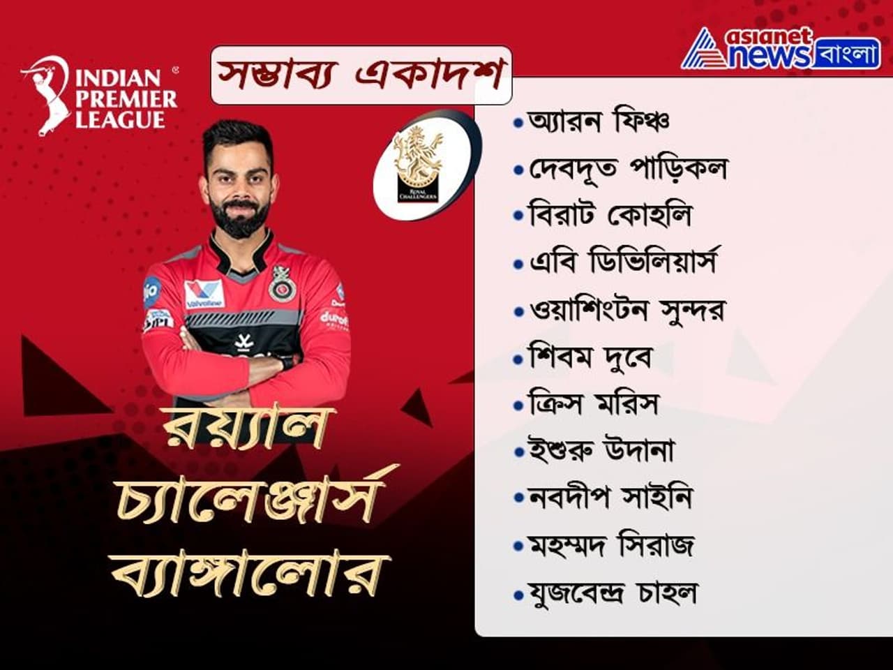 আজ আইপিএলে শারজায় আরও একটি মহারণ। মুখোমুখি বিরাট কোহলির রয়্যাল চ্যালেঞ্জার্স ব্যাঙ্গালোর ও কেএল রাহুলের কিংস ইলেভেন পঞ্জাব। শারজার ছোট মাঠে হাইস্কোরিং গেম হওয়ার সম্ভাবনা খুব বেশি। তবে দ্বিতীয় ইনিংসে পিচ একটু স্লো হওয়ার সম্ভাবনা রয়েছে। এই পরিস্থিতিতে দুই দলের সম্ভাব্য একাদশ নিয়ে চলছে জোর জল্পনা। এখনও পর্যন্ত যা খবর তাতে আরসিবি দলের ওপেনিংয়ের দায়িত্ব সামলাবেন অ্যারন ফিঞ্চ, দেবদূত পাড়িকল। মিডল অর্ডারে থাকছে দলের দুই সেরা তারকা বিরাট কোহলি, এবি ডিভিলিয়ার্স। অলরাউন্ডার দায়িত্ব পালন করছেন ওয়াশিংটন সুন্দর ও শিবম দুবে। বোলিং লাইনআপে দলকে ভরসা দিচ্ছেন ক্রিস মরিস, ইশুরু উদানা, নবদীপ সাইনি, মহম্মদ সাইনি, যুজবেন্দ্র চাহল। বর্তমানে ৭ ম্যাচে ৫ জয়ের সৌজন্যে লিগ টেবিলের তৃতীয় স্থানে রয়েছে আরসিবি। প্রথম পর্বে পঞ্জাবের কাছে হারতে হয়েছিল কোহলির দলকে। আজ ম্যাচ জিতে প্রথম পর্বের বদলা ও লিগ টেবিলে উপরে উঠতে মরিয়া রয়্যাল চ্যালেঞ্জার্স ব্যাঙ্গালোর।