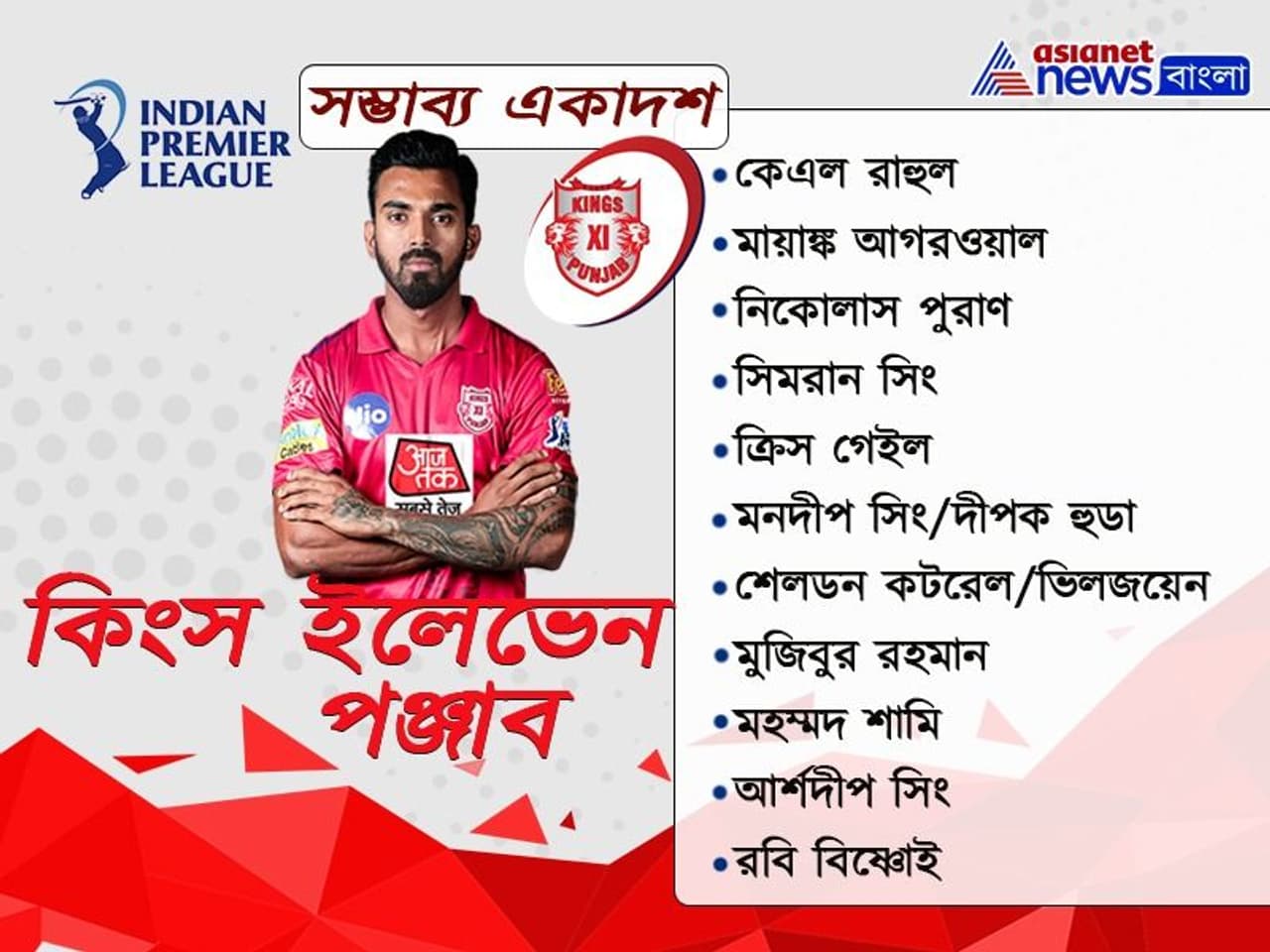 অপরদিকে, টানা ম্যাচ হেরে লিগ টেবিলের একেবারে শেষে রয়েছে কিংস ইলেভেন পঞ্জাব। প্রথম পর্বে শুধু আরসিবির বিরুদ্ধেই জয় পেয়েছিল কেএল রাহুলের দল। আজ আরসিবির বিরুদ্ধে ফের জয় দিয়েই প্রতিযোগিতায় ঘুরে দাঁড়াতে চাইছে কোচ অনিল কুম্বলের দল। আজ পঞ্জাব দলে ওপেনিংয়ে এখনও পর্যন্ত কেএল রাহুল ও মায়াঙ্ক আগরওয়াল আসার কথা। কিন্তু ক্রিস গেইল দলে থাকলে সেক্ষেত্রে পরিবর্তন হলেও হতে পারে। এছাড়াও দলের ব্যাটিং লাইনআপে থাকছেন নিকোলাস পুরাণ, সিমরান সিং, মনদীপ সিং বা দীপক হুডার মধ্যে একজন। বোলিং লাইনআপে থাকছেন মুজিবুর রহমান, মহম্মদ শামি, আর্শদীপ সিং, রবি বিষ্ণোই এছাড়া শেলডন কটরেলের জায়গায় দলে জায়গা পেতে পারেন ভিলজয়েন। আজকের ম্যাচ জিততে মরিয়া অধিনায়ক কএল রাহুল থেকে গোটা কিংস ইলেভেন পঞ্জাব দল।