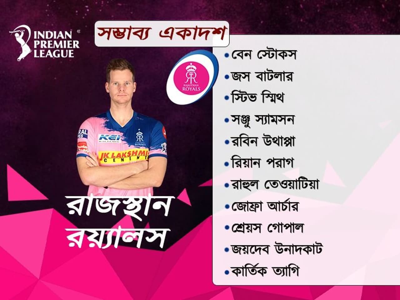 জস বাটলার, স্টিভ স্মিথ, সঞ্জু স্যামসন, রবিন উথাপ্পা, রিয়ান পরাগ। দলে অলরাউন্ডারের ভূমিকায় থাকছেন রাহুলল তেওয়াটিয়া। বোলিং লাইনআপে থাকছেন জোফ্রা আর্চার, শ্রেয়স গোপাল, জয়দেব উনাদকাট, কার্তিক ত্যাগি।