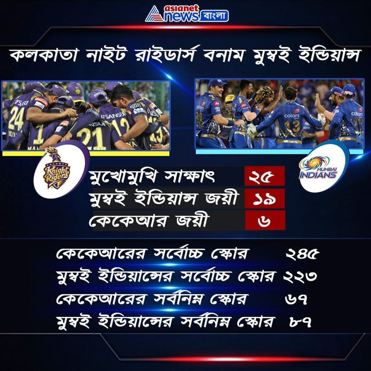 যদিও দুদলের মুখোমুখি পরিসংখ্যান স্বস্তিতে রাখবে মুম্বই ইন্ডিয়ান্সকে। আইপিএলের ইতিহাসে এখনও পর্যন্ত ২৫ বার সাক্ষাৎ হয়েছে দুই দলের। মুম্বই ইন্ডিয়ান্স জিতেছে ১৯ বার ও কলকাতা নাইট রাইডার্স জিতেছে মাত্র ৬ বার। যদিও পরিসংখ্যান নিয়ে ভাবতে নারাজ কেকেআর শিবির। প্রথম ম্য়াচে শুধু মুম্বই বধ নয়, মরুদেশে আইপিএল জয় ছাড়া কিছুই ভাবছে না নাইটরা।