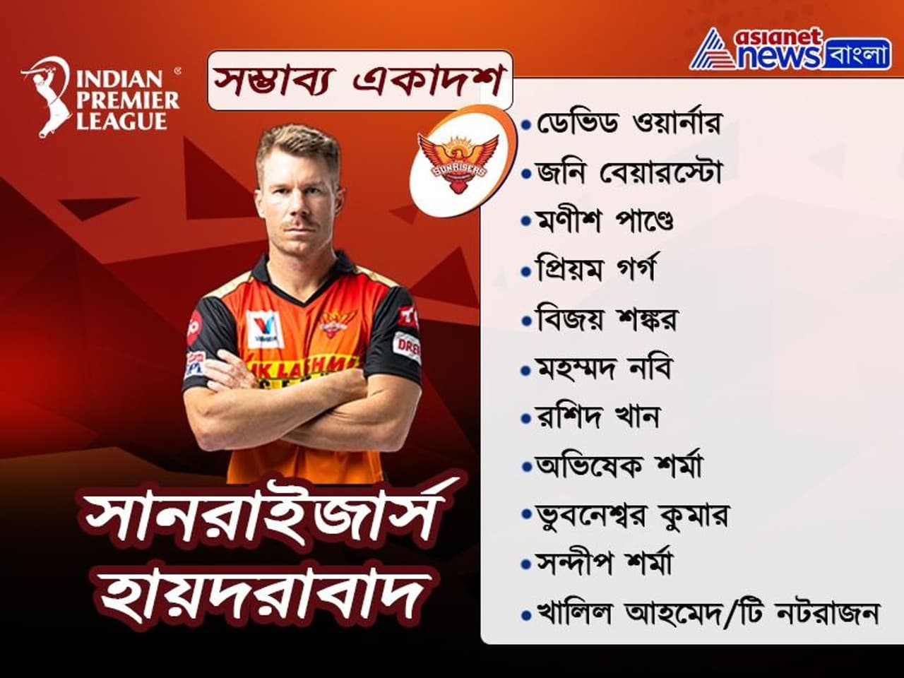 অপরদিকে, যথেষ্ট শক্তিশালী সানরাইজার্স দলও। ওপেনিংয়ে থাকছেন ডেভিড ওয়ার্নার ও জনি বেয়ারস্টো জুটি। প্রথম ম্য়াচে দুরন্ত ফর্মে ছিলেন বেয়ারস্টো। একইসঙ্গে রানে ফিরতে মরিয়া ওয়ার্নারও। মণীশ পাণ্ডে রানে থাকলেও, দলের মিডল অর্ডারের অন্যান্য ব্য়াটসম্য়ানদের নিয়ে চিন্তায় রয়েছে হায়দরাবাদ টিম ম্য়ানেজমেন্ট। দলে থাকছেন প্রিয়ম গর্গ, বিজয় শঙ্কর। দলে ফিরতে পারেন মহম্মদ নবিও। এছাড়াও বোলিং বিভাগের দায়িত্বে থাকছেন রশিদ খান, অভিষেক শর্মা, ভুবনেশ্বর কুমার, সন্দীপ শর্মা, খালিল আহমেদ বা টি নটরাজন।