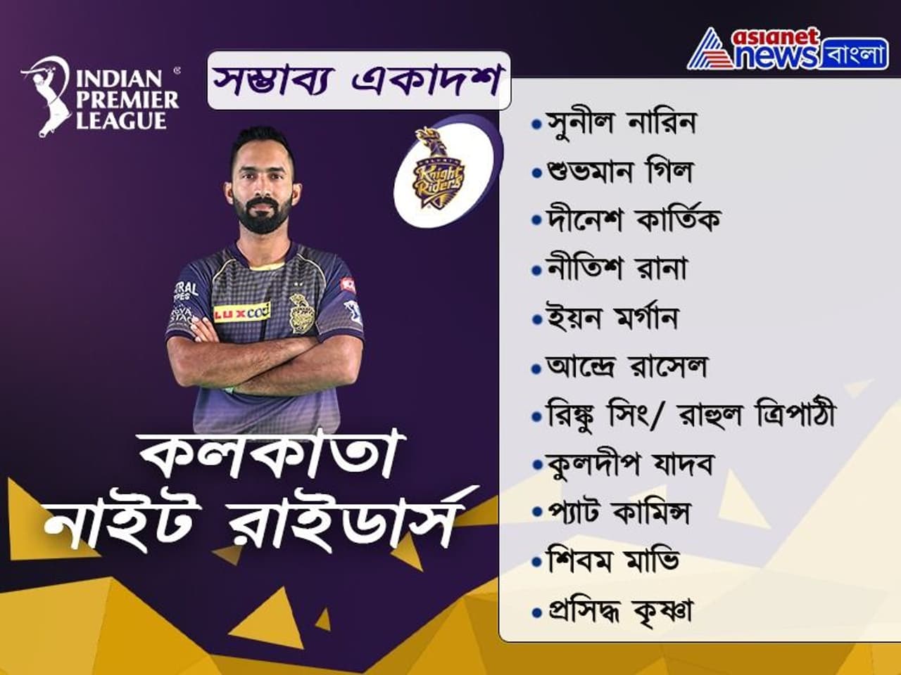 এখনও পর্যন্ত দুই দলের যে সম্ভাব্য একাদশের তালিকা পাওয়া যাচ্ছে তাতে কেকেআরের হয়ে ওপেন করবেন সুনীল নারিন ও শুভমান গিল। মিডল অর্ডারে আসবেন দীনেশ কার্তিক, নীতিশ রানা ও ইয়ন মর্গ্যান। তারপর হার্ড হিটারের ভূমিকায় দেখা যাবে ক্যারেবিয়ান তারকা আন্দ্রে রাসেলকে। তবে প্রয়োজন মত রাসেলকে উপরের দিকেও নামানো হতে পারে। এছাড়া রিঙ্কু সিং ও রাহুল ত্রিপাঠীর মধ্যে একজন দলে সুযোগ পেতে পারেন। দলের স্পিন অ্যাটাকের দায়িত্বে থাকছেন কুলদীপ যাদব ও সুনীল নারিন। এছাড়া পেস অ্যাটাক সামলাবেন প্যাট কামিন্স, শিবম মাভি ও এই ম্য়াচে দলে ফিরতে পারেন প্রসিদ্ধ কৃষ্ণা।