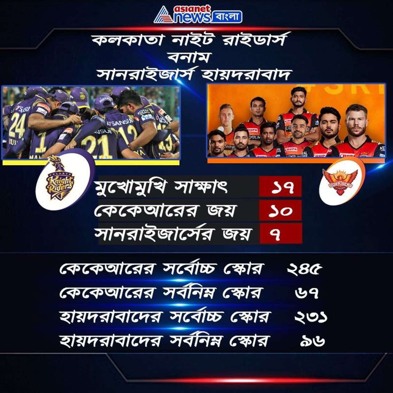 দুই দলের মুখোমুখি সাক্ষাতের পরিসংখ্যান অবশ্য কিছুটা স্বস্তিতে রেখেছে নাইট শিবিরকে। এখনও পর্যন্ত আইপিএলের ইতিহাসে দুই দলের সাক্ষাৎ হয়েছে ১৭ বার। কলকাতা নাইট রাইটার্স জিতেছে ১০। সানরাইজার্স হাদরাবাদ জিতেছে ৭ বার। যদিওল এবার সম্পূর্ণ ভিন্ন দেশে, ভিন্ন পিবেশে খেলা তাই পরিসংখ্যানকে খুব একটা গুরুত্ব দিতে চাইছে কেউ। নিজেদের সেরা ক্রিকেটটা খেলে জয়ে ফিরতে চাইছে ওয়ার্নার ও কার্তিকের দল।