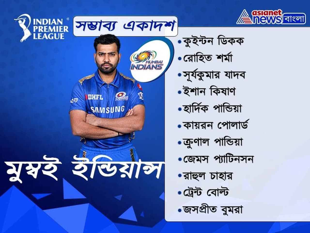 এখন পর্যন্ত যা খবর তাতে রাজস্থানের বিরুদ্ধে অপরবর্তিত থাকতে চলেছে মুম্বই ইন্ডিয়ান্সের প্রথম একাদশ। ওপেনিংয়ে রোহিত শর্মা ও কুইন্টন ডিকক। ডিকক রানে ফেরায় স্বস্তি ফিরেছে মুম্বই দলে। মিডল অর্ডারে থাকছেন সূর্যকুমার যাদব ও ইশান কিষাণ। লোয়ার মিডল অর্ডারে হার্ড হিটারের ভূমিকায় থাকছেন কায়রন পোলার্ড ও হার্দিক পান্ডডিয়া। বিধ্বংসী ফর্মে রয়েছেন দুজন। দলের স্পিন বিভাগের দায়িত্ব সামলাবেন ক্রুণাল পান্ডিয়া ও রাহুল চাহার। পেস অ্যাটাকে দুরন্ত ফর্মে রয়েছে মুম্বই ইন্ডিয়ান্সের পেস ত্রয়ী বুমার-বোল্ট-প্যাটিনসন জুটি।