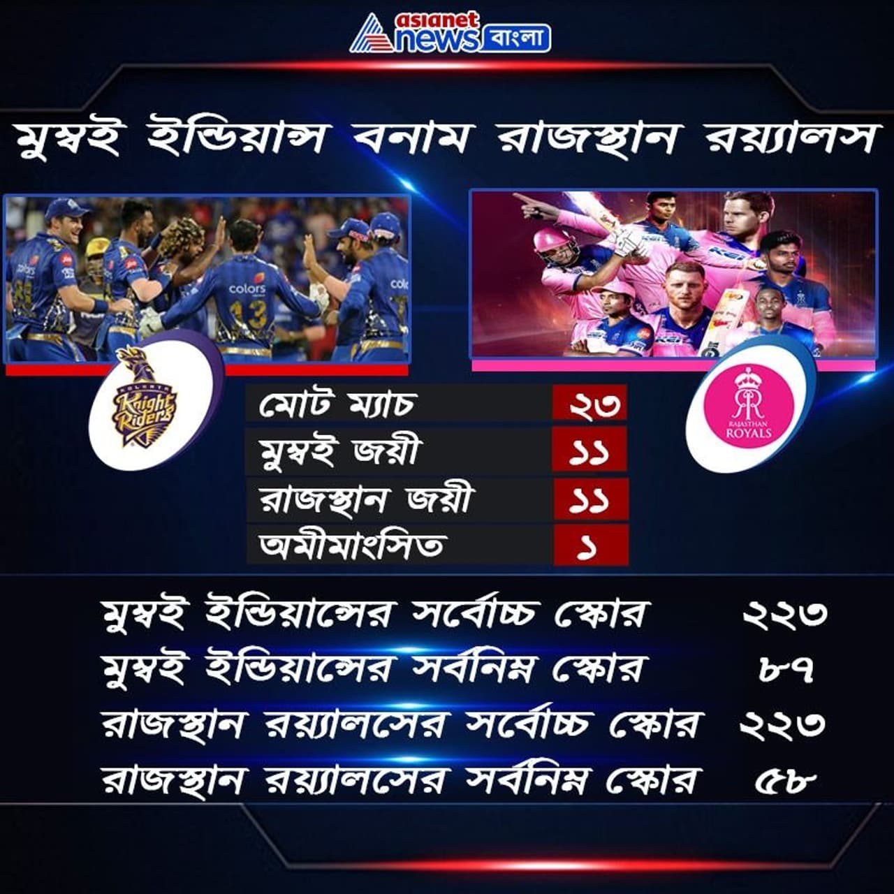 দুদলের মুখোমুখি সাক্ষাতের পরিসংখ্যান কিন্তু হাড্ডাহাড্ডি লড়াইয়ের ইঙ্গিত দিচ্ছে। আইপিএলের ইতিহাসে এখনও পর্যন্ত মোট ২৩ বার মুখোমুখি হেয়ছে দুই দল। মুম্বই ইন্ডিয়ান্স জিতেছে ১১ বার ও রাজস্থান রয়্যালস জিতেছে ১১ বার। একটি ম্য়াচ অমীমাংসিত। বর্তমানে দলগত শক্তির বিচারে মুম্বই ইন্ডিয়ান্স এগিয়ে থাকলেও, মুম্বই ইন্ডিয়ান্সকে এক ইঞ্চিও জমি ছাড়তে নারাজ স্টিভ স্মিথের দল।