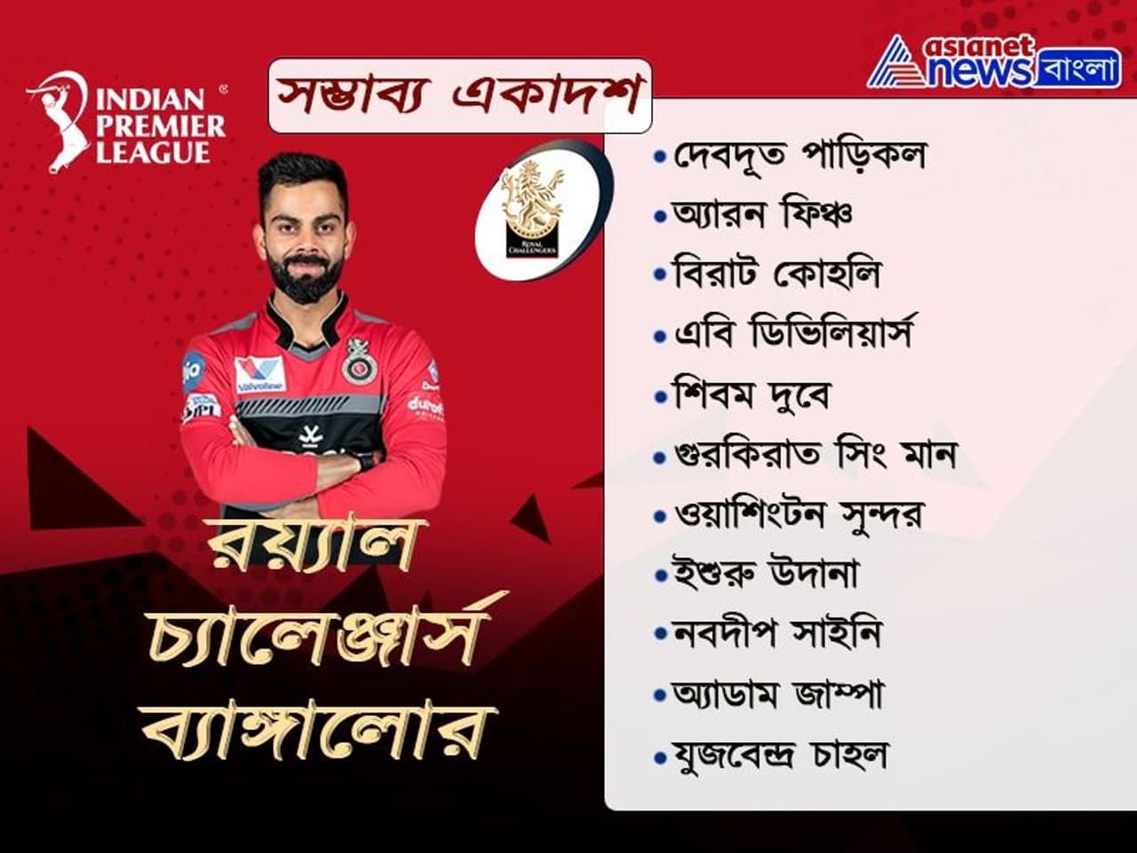 এখনও পর্যন্ত আরসিবির সম্ভাব্য একাদশ সম্পর্কে যা জানা যাচ্ছে, তাতে উইনিং কম্বিনেশন ভাঙছে না দল। দলের ব্যাটিং লাইনআপে থাকছে দেবদূত পাড়িকল, অ্যারন ফিঞ্চ, বিরাট কোহলি, এবি ডিভিলিয়ার্স, শিবম দুবে, গুরকিরাত সিং মান। বোলিংয় লাইনআপে থাকছেন ওয়াশিংটন সুন্দর, ইশুরু উদানা, নবদীপ সাইনি, অ্যাডাম জাম্পা, যুজবেন্দ্র চাহল। শেষ ম্যাচে রানে ফিরেছেন অধিনায়ক বিরাট কোহলি। তা বাড়তি আত্মবিশ্বাস যোগ করেছে আরসিবি শিবিরে। আজকের ম্যাচে দিল্লিকে হারানোর বিষয়েও আশাবাদী আরসিবি শিবির।
