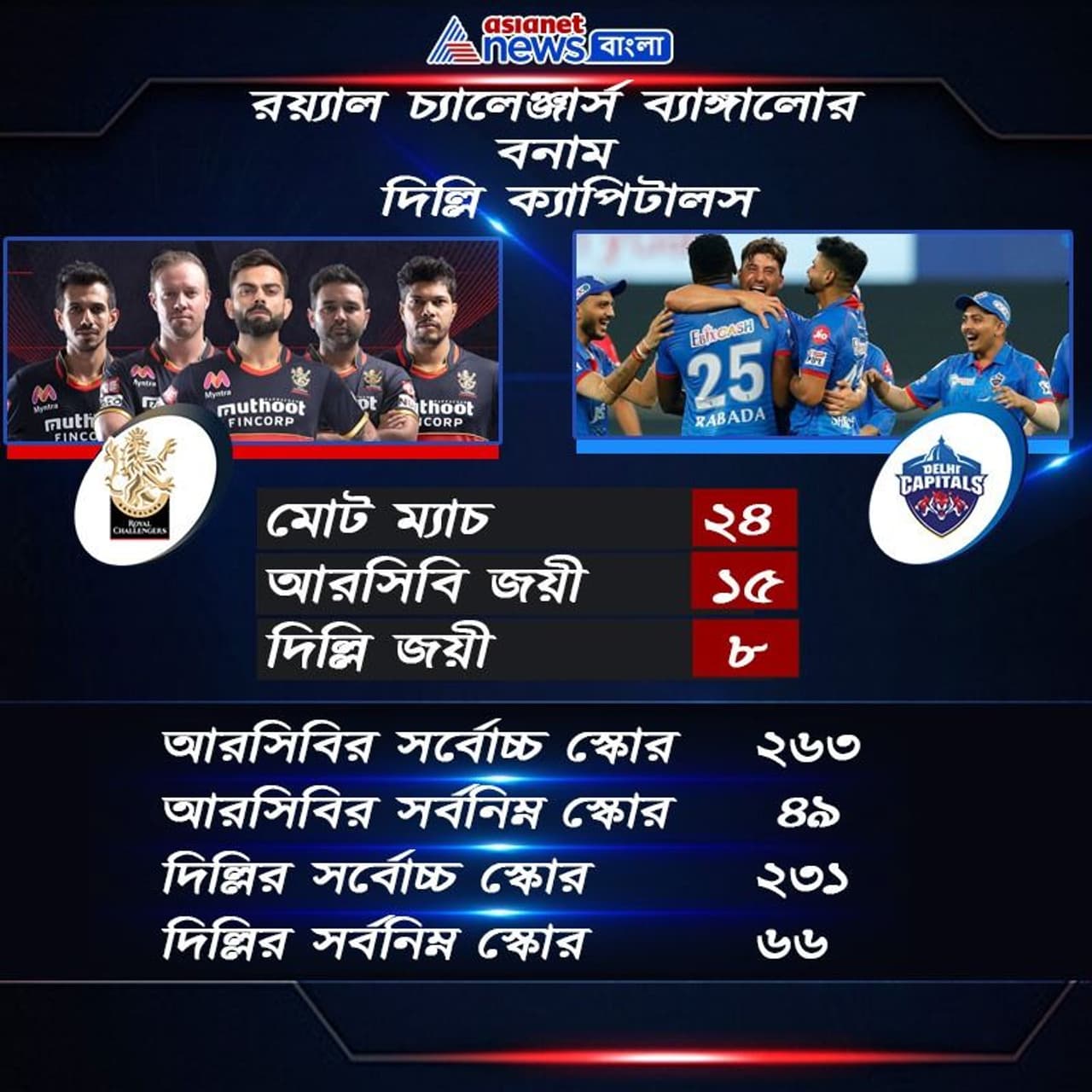 দুই দলের মুখোমুখি সাক্ষাতের পরিসংখ্যান কিন্তু কিছুটা স্বস্তি দিচ্ছে বিরাট কোহলির দলকে। এখনও পর্যন্ত আইপিএলের ইতিহাসে মোট ২৪ বার সাক্ষাৎ হয়েছে দুই দলের। তার মধ্যে ১৫ বার জিতেছে রয়্যাল চ্যালেঞ্জার্স ব্যাঙ্গালোর ও মাত্র ৮ বার জিতেছে দিল্লি ক্যাপিটালস। কিন্তু এবছর দুরন্ত পারফর্ম করছে দুই দল। তাই আরও একটি হাড্ডাহাড্ডি ম্যাচ দেখার অপেক্ষায় ক্রিকেট বিশ্ব।