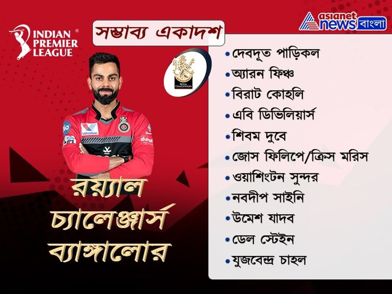 এখনও পর্যন্ত দুই দলের সম্ভাব্য যে একাদশ পাওয়া যাচ্ছে তাতে আরসিবির হয়ে ওপেন করতে চলেছেন অ্যারন ফিঞ্চ ও দেবদূত পাড়িকল। মিডল অর্ডারে দায়িত্ব থাকবে বিরাট কোহলি ও এবি ডিভিলিয়ার্সের উপর। শেষের দিকে শিবম দুবে ও জোস ফিলিপে এবম ক্রিস মরিসের মধ্যে একজন। বোলিং বিভাগের স্পিন অ্যাটাকে থাকছেন ওয়াশিংটন সুন্দর, যুজবেন্দ্র চাহল। পেস বিভাগে থাকছেন ডেল স্টেইন, উমেশ যাদব ও নবদীপ সাইনি। ব্য়াটিংয়ে দেবদূত পাড়িকল ও ডিভিলিয়ার্স, ফিঞ্চের ফর্ম বিরাট কোহলিকে ভরসা জোগালেও, বোলিং বিভাগে পেস বোলিং বিভাগে উমেশ যাদব ও ডেল স্টেইনের ফর্ম কিছুটা চিন্তায় রেখেছে বিরাটকে।