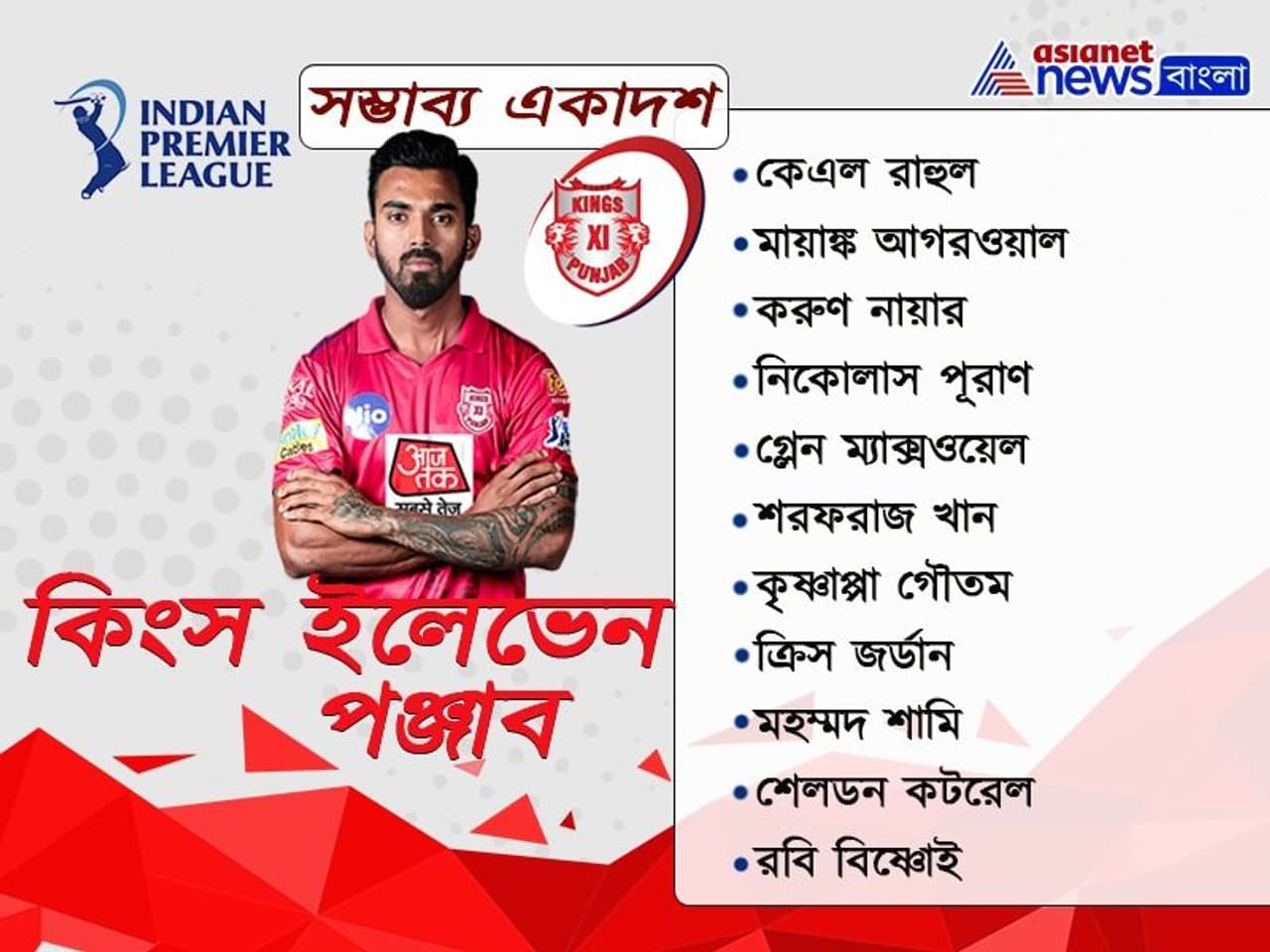 অপরদিকে প্রথম ম্যাচে সুপার ওভারের হার এখন অতীত। হার থেকে শিক্ষা নিয়ে জয়ে ফিরতে মরিয়া কেএল রাহুলের দল। কিংস ইলেভেন পঞ্জাবের যে সম্ভাব্য একাদশ পাওয়া যাচ্ছে তাতে ওপেনিংয়ে আসছেন কেএল রাহুল ও মায়াঙ্ক আগরওয়াল। মিডল অর্ডারে দায়িত্বে থাকছেন করুণ নায়ার, নিকোলাস পূরাণ, গ্লেন ম্যাক্সওয়েল। এছাড়াও রেয়ছে সরফরাজ খান ও কৃষ্ণাপ্পা গৌতম। স্পিন বিভাগের দায়িত্বে গৌতমের সঙ্গে থাকছেন তরুণ রবি বিষ্ণোই। পেস অ্যাটাকে ক্রিস জর্ডান, মহম্মদ শামি, শেলডন কটরেল।