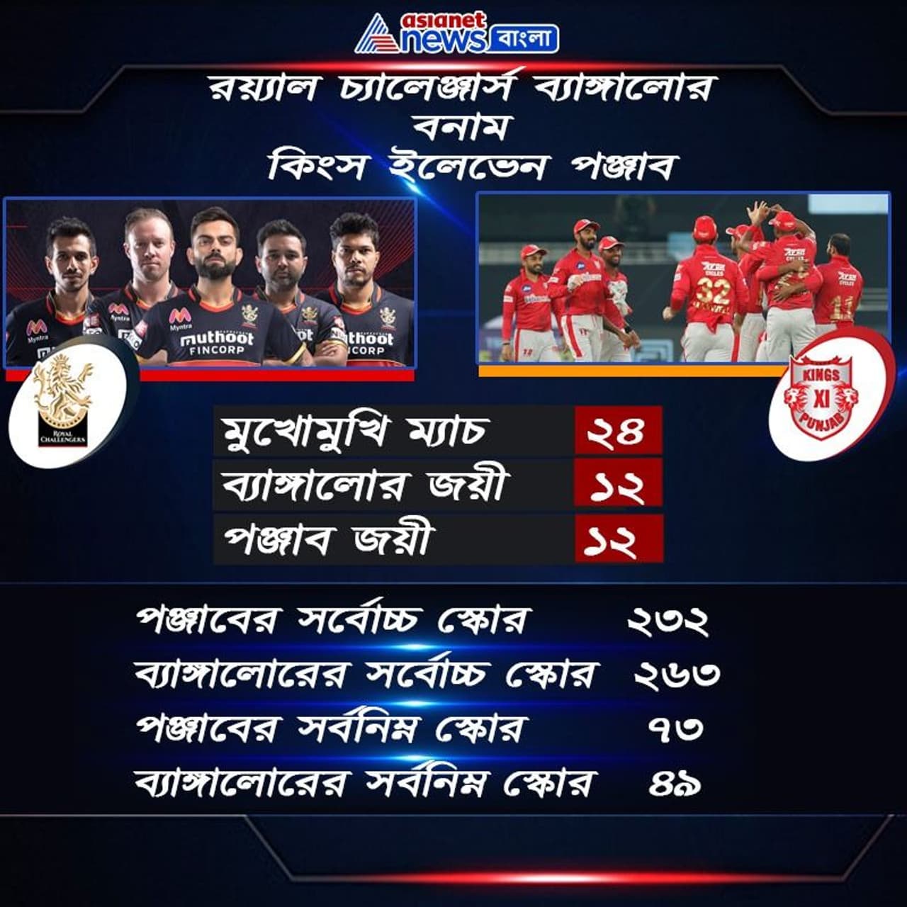 এই দুদল যতবার মুখোমুখি দেখা হয়েছে হাড্ডাহাড্ডি লড়াইয়ের সাক্ষি থেকেছে ক্রিকেট বিশ্ব। আইপিএলের ইতিহাসে মোট ২৪ বার সাক্ষাৎ হয়েছে দুই দলের। ১২ বার জয় পেয়েছে রয়্যাল চ্যালেঞ্জার্স ব্যাঙ্গালোর ও ১২ বার জয় পেয়েছে কিংস ইলেভেন পঞ্জাব। ফলে আজকেও আরও একটি রুদ্ধশ্বাস ম্যাচ দেখার অপেক্ষায় প্রহর গুনছেন ক্রিকেট ভক্তরা।