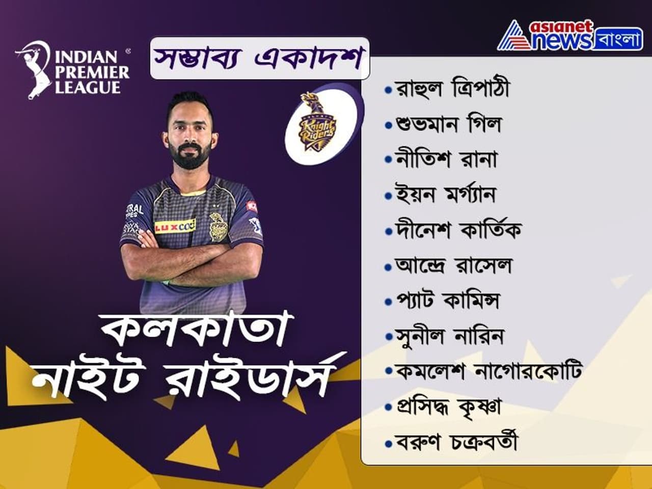 এখনও পর্যন্ত যা খবর, কেকেআরের হয়ে ওপেনিং আসতে চলেছেন রাহুল ত্রিপাঠী ও শুভমান গিল জুটি। মিডল অর্ডারে ব্যাট করতে আসবেন নীতিশ রানা, ইয়ন মর্গ্যান, দীনেশ কার্তিক। শেষে হার্ড হিটারের ভূমিকায় থাকছে ক্যারেবিয়ান তারকা আন্দ্রে রাসেল। তবে রাসেলের অফ ফর্ম নিয়ে চিন্তায় রয়েছে কেকেআর শিবির। দ্রুত রানে ফেরার জন্য মরিয়া হয়ে উঠেছেন রাসেলও। এছাড়া বোলিং বিভাগে দলের স্পিন অ্যাটাকের দায়িত্ব সামলাবেন সুনীল নারিন ও বরুণ চক্রবর্তী। সুনীল নারিনকে প্রয়োজনে উপরের দিকে ব্য়াটিং করতেও পাঠানো হতে পারে। অপর দিকে পেস অ্যাটাকের নেতৃত্ব দেবেন প্যাট কামিন্স। তাকে সঙ্গত দেবেন প্রসিদ্ধ কৃষ্ণা ও কমলেশ নাগোরকোটি।