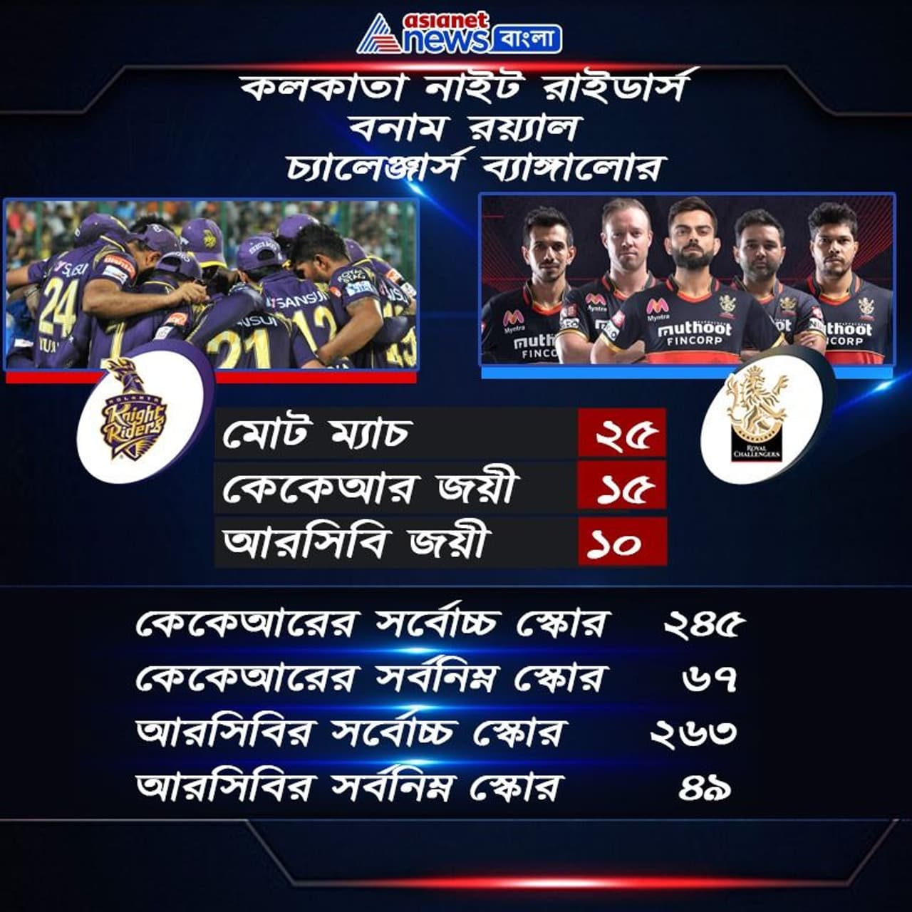 এই বছর আইপিএলে দুই দলে খুব বেশি তফাৎ না থাকলেও, সা্মগ্রিক পরিসংখ্যান কিন্তু স্বস্তি দিচ্ছে কেকেআরকে। কারণ এখনও পর্যন্ত আইপিএলের ইতিহাসে মোট ২৫ বার সাক্ষাৎ হয়েছে দুই দলের। কলকাতা নাইট রাইডার্স জিতেছে ১৫ বার ও রয়্যাল চ্যালেঞ্জার্স ব্যাঙ্গালোর জিতেছে ১০ বার। কিন্তু মরুদেশে সম্পূর্ণ অন্য ফর্মে রয়েছে আরসিবি। ছন্দে রয়েছে কেকেআরও। তাই ভিকে ও ডিকে-র দ্বৈরথ দেখার অপেক্ষায় ক্রিকেট বিশ্ব।