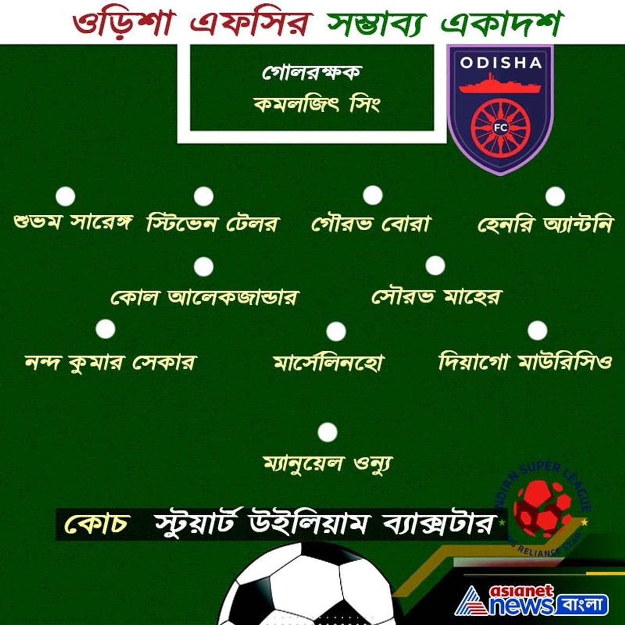 অপরদিকে, ওডিশার কোচ স্টুয়ার্ট বাক্সটারের অধীনে ২টি ম্য়াচে খেলা হয়ে গিয়েছে। জামশেদপুরের বিরুদ্ধে আগের ম্যাচ ড্র করলেও প্রথম ম্যাচে তারা হায়দরাবাদের কাছে ম্য়াচ হারতে হয়েছিল ওড়িশাকে। তাই বাগানের বিরুদ্ধে ঘুড়ে দাঁড়ানোর লড়াই বাক্সটারের দলের। প্রধান প্লেয়ারমার্সেলিনহো হলেও, এন কুমার, মার্সেলিনহো, এলপি সিং, বোরা, অ্যালেকজান্ডারদের উপরও ভরসা রাখছেন ওড়িশা কোচ। এটিকে মোহনবাগানের মত শক্তিশালী দলের বিরুদ্ধে সংঘবদ্ধ ফুটবল খেলেই বাজিমাত করতে চান স্টুয়ার্ট বাক্সটার। এক নজরে দেখে নেওয়া যাক ওড়িশা এফসির সম্ভাব্য একাদশ।