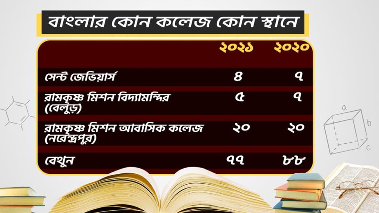'ন্যাশনাল ইনস্টিটিউশনাল র্যাঙ্কিং ফ্রেমওয়ার্ক'-এর তরফ থেকে প্রতি বছর বিশ্বের সেরা বিশ্ববিদ্যালয়ের পাশাপাশি সেরা ইঞ্জিনিয়ারিং কলেজ, সেরা মেডিক্যাল কলেজ, সেরা ম্যানেজমেন্ট কলেজগুলির নাম ও প্রকাশ করা হয়। সেই তালিকা অনুসারে গত বছরের তুলনায় খানিকটা উন্নতি বাংলার প্রতিষ্ঠানগুলির। গতবছর সেন্ট জেভিয়ার্স কলেজের নাম ছিল সপ্তম স্থানে। এই বছর সেই র্যাঙ্কিং তিন ধাপ এগিয়ে সেন্ট জেভিয়ার্স কলেজের নাম চতুর্থ স্থানে। একইভাবে রামকৃষ্ণ মিশন বেলুড়, সপ্তম স্থানে যা এই বছর কিছুটা এগিয়ে এসেছে। বর্তমানে রামকৃষ্ণ মিশন বেলুড় রয়েছে পঞ্চম স্থানে।