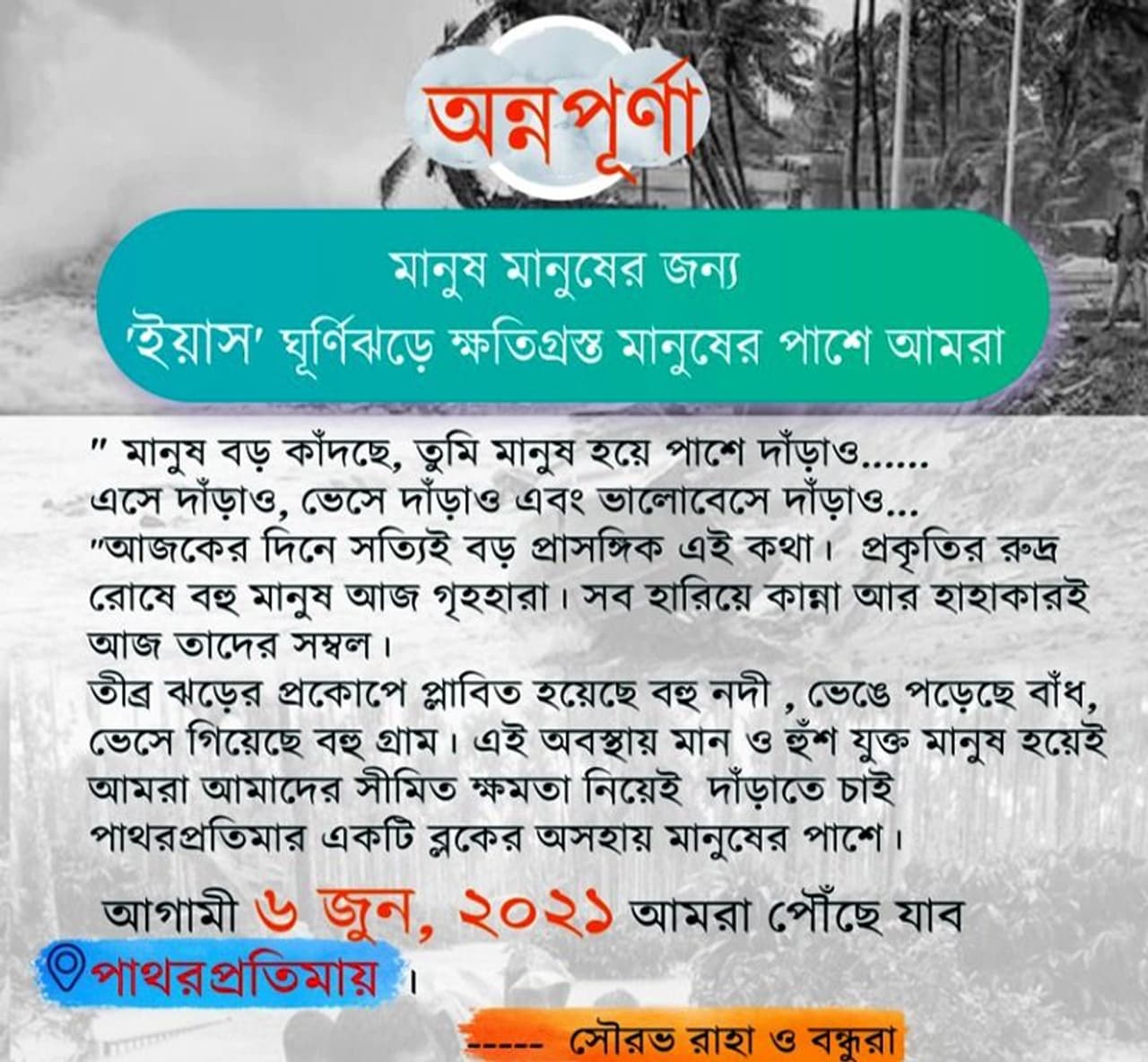 তবে শুধু খাবারই নয় কোভিড মোকাবিলায় শহরবাসীদের মাস্ক এবং স্যানিটাইজারও বিনামূল্য়ে দিচ্ছেন সৌরভ এবং তাঁর বন্ধুরা। তিনি আরও জানিয়েছেন, একাজে তাঁদেরকে সাহায্য করেছে পাটুলি থানাও। সাহায্য হাত এগিয়ে দিয়েছেন অনেকেই। উল্লেখ্য একদিকে কোভিডে হাহাকার, অপরদিকে এরমাঝে ভয়াবহ ঘূর্ণিঝড়ের দোসর। এই পরিস্থিতিতে সৌরভ জানিয়েছেন, তাঁরা আগামী ৬ জুন পাথরপ্রতিমা গিয়ে ২০০ জনকে ডাল-চাল খাবার পৌছে দেবেন।