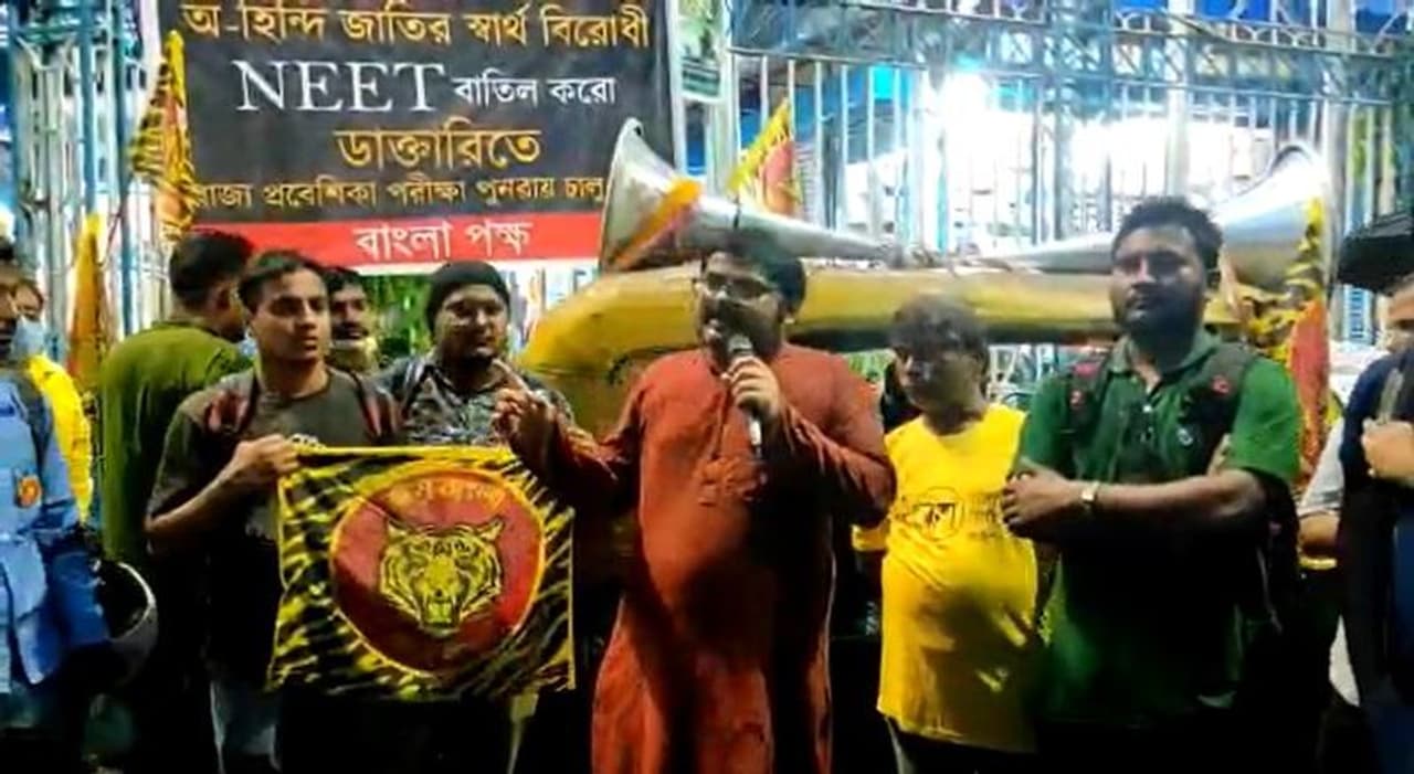 ডাক্তারি প্রবেশিকা পরীক্ষা নিট (NEET) বাতিলের দাবিতে কলকাতায় বিক্ষোভ দেখাল বাংলা পক্ষ। তাঁদের দাবি, নিট আসলে বাঙালি বিরোধী। এর ফলে বাংলা বোর্ডে পড়াশোনা করা পড়ুয়াদের চিকিৎসক হওয়ার স্বপ্ন ভঙ্গ হয়ে যাচ্ছে। সেই কারণে এই পরীক্ষা অবিলম্বে বাতিল করা হোক। এই দাবিতে শনিবার কলকাতার হাজরা মোড়ে একটি পথসভার আয়োজন করেন তাঁরা।