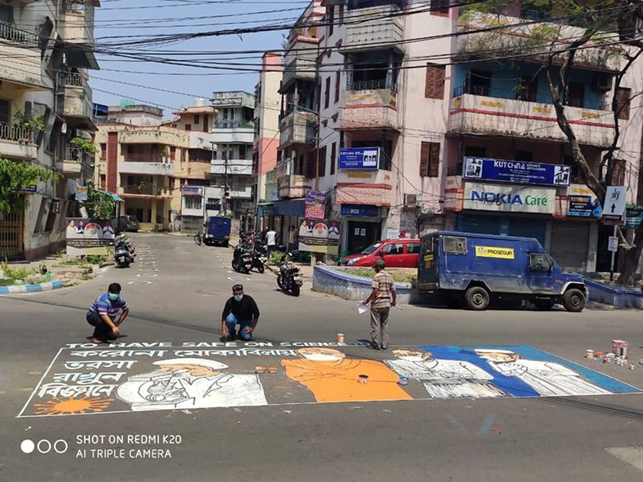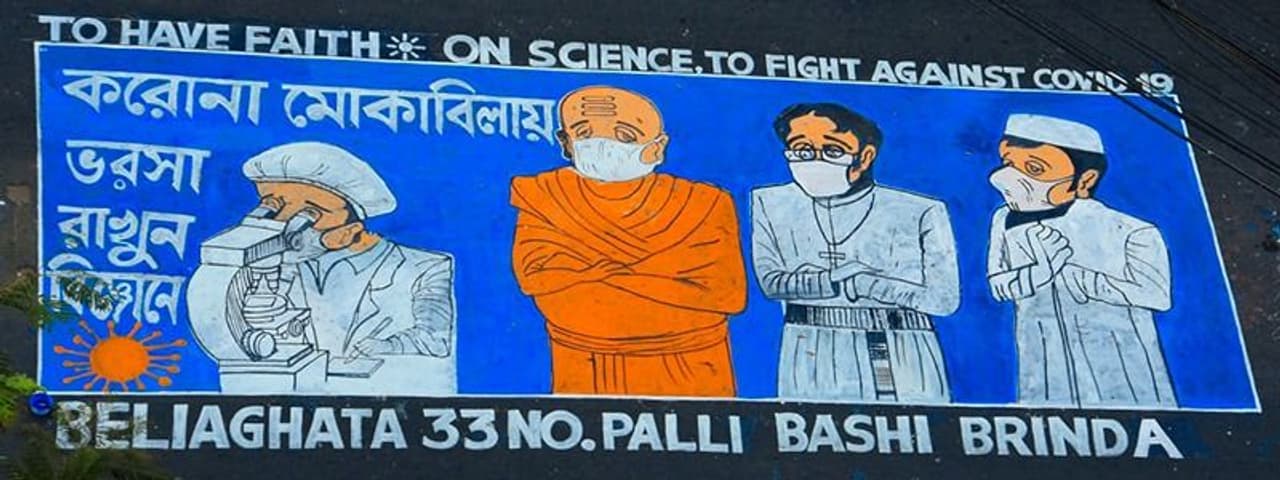 অপরদিকে, বেলেঘাটা ৩৩ পল্লীর পুজোয় ২০০৭ সাল থেকে ছবি আঁকার মাধ্য়মে নতুন কিছু চিন্তা ভাবনা তুলে ধরেন তাঁদেরই ক্লাবের এক সদস্য়। আর এবারও তার ব্য়াতিক্রম গেল না। করোনা রুখতে জন সচেতনতার ফুটিয়ে তুলতে বেলেঘাটা আইডি হাসপাতাল থেকে এক কিলোমিটার দূরে রাস্তার উপরে তিন ধর্মের মানুষের ছবি আঁকা হয়েছে। যাদের প্রত্য়েকের মুখেই মাস্ক। তাদের সঙ্গে রয়েছেন একজন গবেষক, যিনি চোখ রেখেছেন মাইক্রোস্কোপে। তারই সঙ্গে অসাধারণ সেই লেখা 'করোনা মোকাবিলায় ভরসা রাখুন বিজ্ঞানে'।