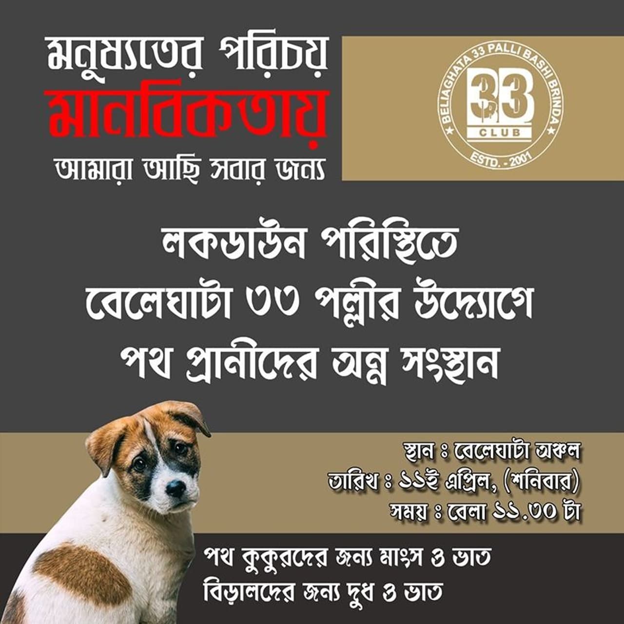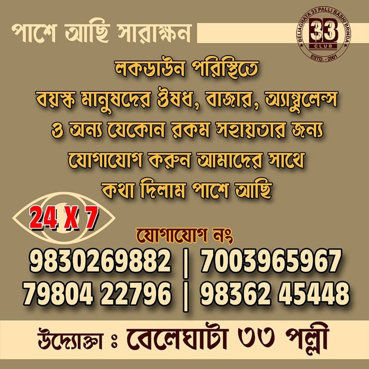 বেলেঘাটা ৩৩ পল্লী-র সাধারণ সম্পাদক সুশান্ত সাহা জানালেন, তাঁদের একটি হোয়াটসং অ্য়াপ গ্রুপ রয়েছে। যেখানে রয়েছেন ক্লাবের মোট ৬৫ জন সদস্য়। সেখানেই কীভাবে করোনা পরিস্থিতিতে অসহায় মানুষদের সাহায্য় করা যায়, তা নিয়ে বিস্তারিত আলোচনা চলে। ক্লাবের সদস্য়রাই নিজেদের অ্য়াকাউন্ট থেকে মোট ৭২,০০০ হাজার টাকা সংগ্রহ করে। এবং সেই টাকা দিয়েই কেনা হয় খাদ্য় সামগ্রী, মাস্ক, সাবান। খাদ্য় সামগ্রীর মধ্য়ে রয়েছে-চাল, ডাল, আলু, আটা, হলুদ ইত্য়াদি। এই বিপুল প্রয়োজনীয় সামগ্রী তুলে দেওয়া হয় এলাকার নিকটবর্তী বস্তি-কলোনীর ৫০০ টি পরিবারকে। পাশাপাশি তিনি আরও জানিয়েছেন, সামনের ১৪ এপ্রিল আরও ৪০০ টি দুঃস্থ পরিবারকে তাঁরা খাদ্য় সামগ্রী, মাস্ক এবং সাবান তুলে দেবেন। অপরদিকে বেলেঘাটা ৩৩ পল্লীর সাধারণ সম্পাদক আরও জানালেন যে, ১১ এপ্রিল সকাল ১০ টার সময় পথ-কুকুরদের খাবার খাওয়ানোর উদ্দেশ্য়ে বের হবেন। কারণ পথ-কুকুররা সারাবছরই এলাকাবাসীর থেকে খাবার পেয়ে থাকে। কিন্তু লকডাউনের জেরে সেই খাবার আসা বন্ধ হয়েছে। পাশাপাশি তিনি জানালেন, এলাকার প্রবীণ নাগরিকদের ওষুধ-গ্য়াস প্রয়োজনীয় যেকোনও জিনিস কিনতে হলে তাদের যেনও ফোন করা হয়। তারাই সেগুলি আবাসিকদের বাড়ি পৌছে দেবে।