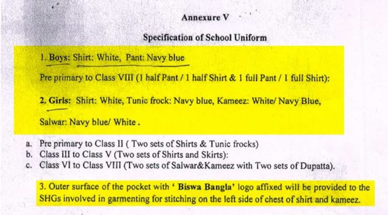 সূত্রের খবর, নীল সাদা রঙের স্কুল পোশাক করার ভাবনা রাজ্য সরকারের অনেকদিন আগে থেকেই ছিল। কয়েকদিন আগে সমগ্র শিক্ষা মিশনের একটি নোটিসও ছড়িয়ে পড়ে। সেখানে দেখা যায়, স্কুলের ইউনিফর্মগুলিকে নীল সাদা রং করতে বলা হয়েছে। শিক্ষকদের একাংশের তরফে জানানো হয়েছে, তাঁরা এমন বিজ্ঞপ্তি পেয়েছেন যেখানে স্কুলের পোশাক নীল সাদা রঙের করতে বলা হয়েছে। শিক্ষক সংগঠন সূত্রে এমনটাও জানা গিয়েছে, স্কুলের পোশাক নীল সাদা হওয়ার পাশাপাশি, স্কুলের ইউনিফর্মে থাকতে পারে বিশ্ব বাংলার লোগো।