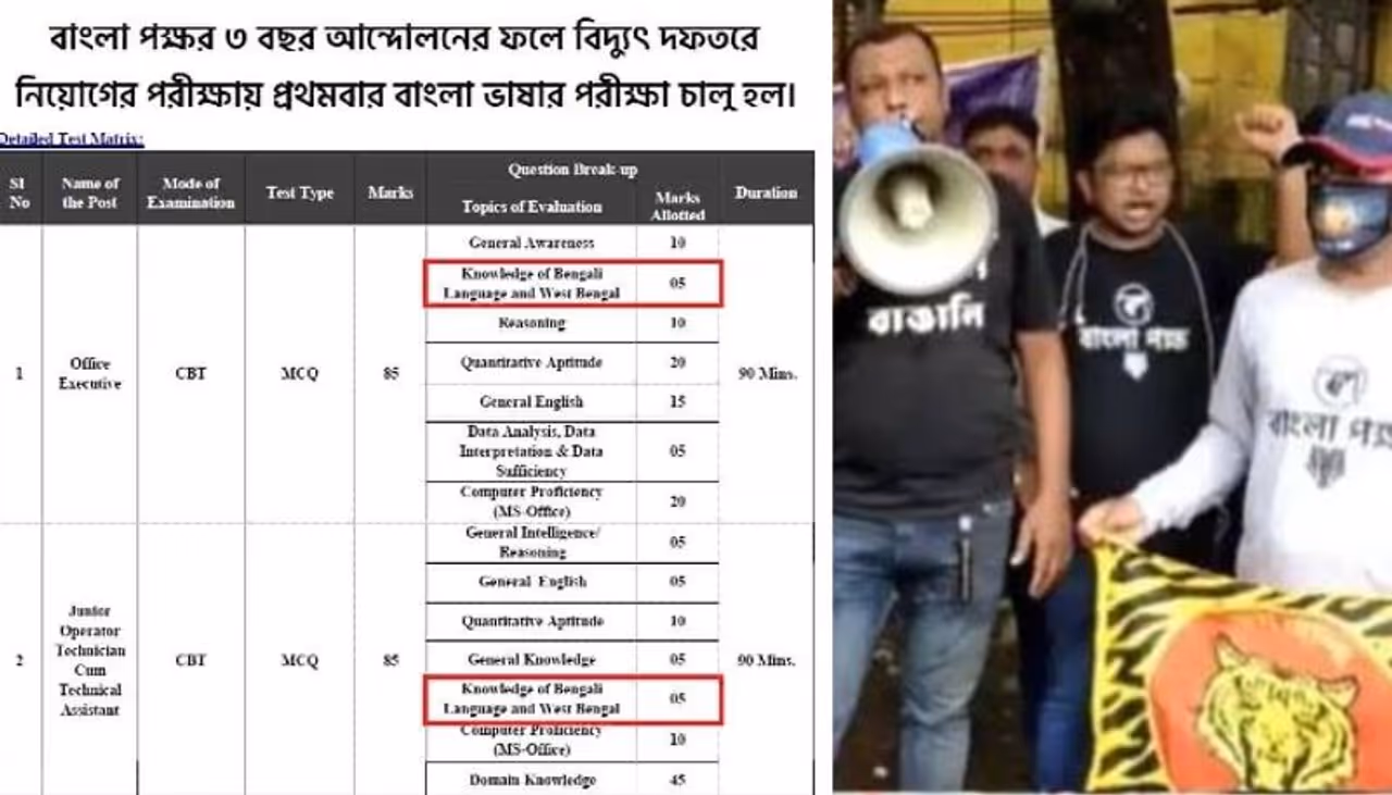 দীর্ঘ ৩ বছরের আন্দোলনের ফলে রাজ‍্য বিদ‍্যুৎ বন্টন সংস্থার নিয়োগ পরীক্ষায় বাংলা ভাষার পরীক্ষা বাধ‍্যতামূলক করা হয়েছে।  সব রাজ্য সরকারি চাকরি নিয়োগের আগে লিখিত বাংলা ভাষা পরীক্ষা পাশ করা বাধ্যতামূলক করতে হবে, দাবি বাংলাপক্ষের।