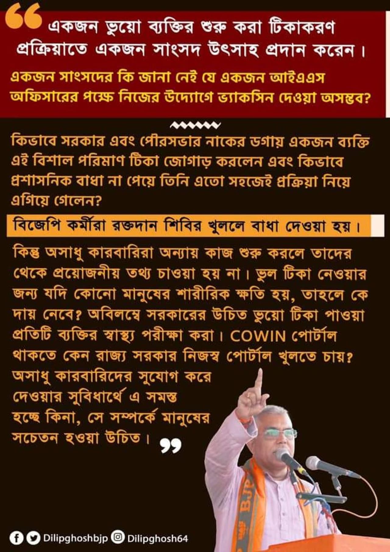 শুভেন্দু অধিকারী আরও বলেন, তিনি ডাক্তার নন, তাই বলতে পারবেন না ভুয়ো টিকা নিয়ে মানুষ অসুস্থ হয়ে পড়বে কিনা। কিন্তু, যদি কিছু ঘটত, তাহলে বলা হত, নরেন্দ্র মোদীর পাঠানো টিকা নিয়ে মানুষ অসুস্থ হয়ে পড়েছেন। বাগড়ি মার্কেট থেকে টিকা কেনার দাবি করেছেন, দেবাঞ্জন। শুভেন্দু অধিকারী বলেন, রাজ্য বিজেপি সন্দেহ করছে, এই ঘটনার পিছনে কোনও বড় ষড়যন্ত্র রয়েছে। সম্ভবত নরেন্দ্র মোদী তথা কেন্দ্রীয় সরকারকে বদনাম করার উদ্দেশ্যে এইসব ভুয়ো টিকাদান শিবিরগুলি পরিচালনা করা হয়েছে।