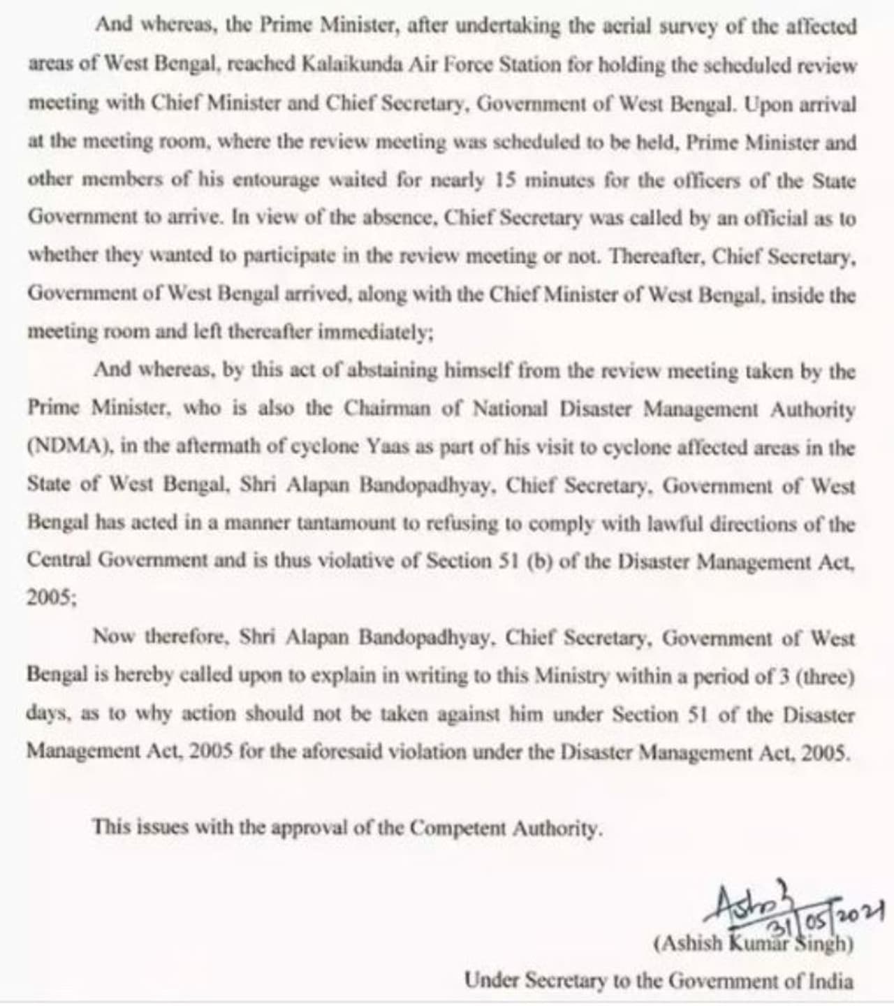 কেন্দ্রের তরফে শোকজ নোটিসে বলা হয়েছে,‘২৮ মে প্রধানমন্ত্রীর ইয়াস-বৈঠক কেন এড়িয়ে গেলেন আলাপন বন্দ্যোপাধ্যায়? বিপর্যয় মোকাবিলা আইনের (২০০৫) ৫১ ধারা অনুযায়ী ওই আইন লঙ্ঘন করার জন্য তাঁর বিরুদ্ধে কোনও ব্যবস্থা নেওয়া হবে না, তা তিন দিনের মধ্যে লিখিত ভাবে জানানো হোক’। শুধু তাই ন সরাসরি দিল্লিতে গিয়ে সশরীরে জবাবদিহি করার নির্দেশ দেওয়া হয়েছে শো-কজ চিঠিতে। যদিও এই চিঠি নিয়ে এখনও কোনও মন্তব্য করেননি আলাপন বন্দ্যোপাধ্যায়। যথা সময়ে উত্তর দেওয়া হবে বলে খবর নবান্ন সূত্রে।