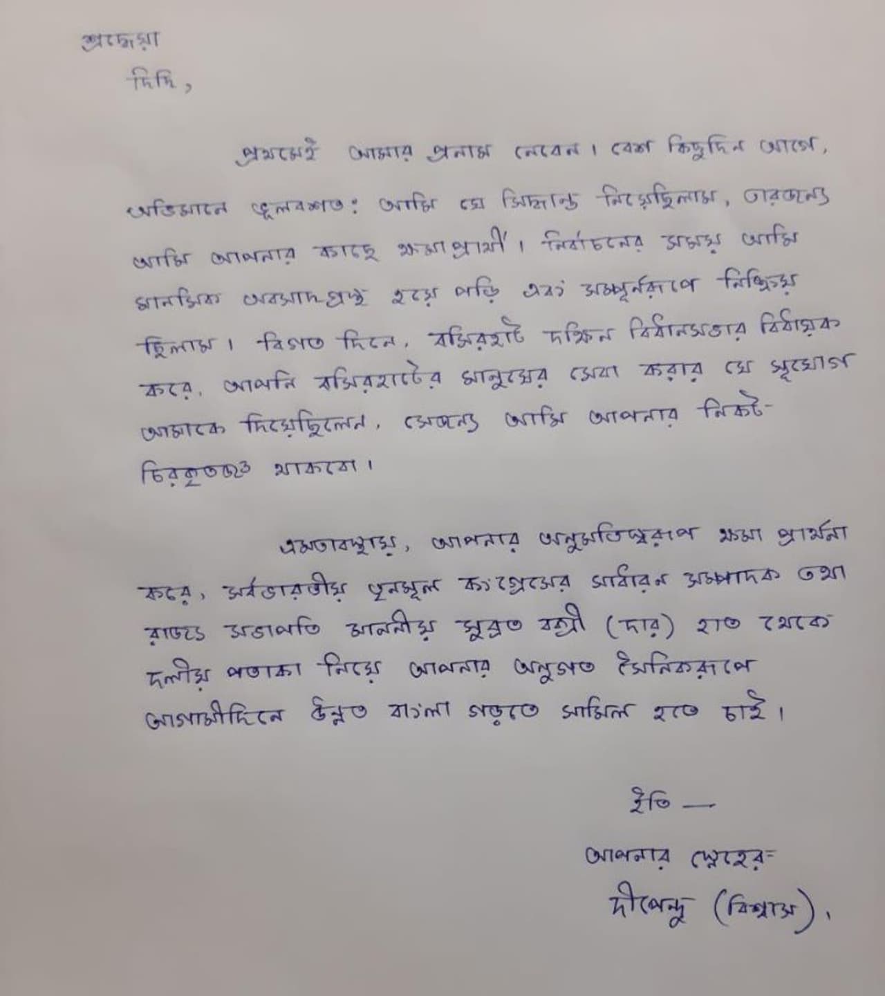 দলে ফিরতে চেয়ে সরাসরি দলনেত্রীকে চিঠি লিখলেন বসিরহাট দক্ষিণের প্রাক্তন টিএমসি বিধায়ক দীপেন্দু বিশ্বাস। কলকাতার তিন প্রধানে খেলা প্রাক্তন ফুটবলার মুখ্যমন্ত্রীকে চিঠিতে লেখেন,'প্রথমেই আমার প্রণাম নেবেন। বেশ কিছুদিন আগে অভিমানে ভুলবশত আমি যে সিদ্ধান্ত নিয়েছিলাম, তার জন্য আমি আপনার কাছে ক্ষমাপ্রার্থী। নির্বাচনের সময় আমি মানসিক অবসাদগ্রস্ত হয়ে পড়ি এবং সম্পূর্ণরূপে নিষ্ক্রিয় ছিলাম। বিগত দিনে, বসিরহাট দক্ষিণ বিধানসভার বিধায়ক করে আপনি বসিরহাটের মানুষের সেবা করার যে সুযোগ আমাকে দিয়েছিলেন, সে জন্য আমি আপনার নিকট চিরকৃতজ্ঞ থাকব। এমতাবস্তায়, আপনার অনুমতিস্বরূপ ক্ষমা প্রার্থনা করে, সর্বভারতীয় তৃণমূল কংগ্রেসের সাধারণ সম্পাদক তথা রাজ্য সভাপতি মাননীয় সুব্রত বক্সী (দার) হাত থেকে দলীয় পতাকা নিয়ে আপনার অনুগত সৈনিকরূপে আগামিদিনে উন্নত বাংলা গড়তে শামিল হতে চাই।'