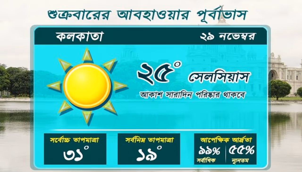 আবহাওয়া দফতরের খবর অনুযায়ী, শুক্রবার শহরের সর্বোচ্চ তাপমাত্রা থাকতে পারে ৩১ ডিগ্রি সেলসিয়াসের কাছাকাছি। শহরের সর্বনিম্ন তাপমাত্রার পারদ ছুঁতে পারে ১৯ ডিগ্রি সেলসিয়াস। শহরের বাতাসে আপেক্ষিক আর্দ্রতার পরিমাণ সর্বাধিক ৯৯ শতাংশ। আপেক্ষিক আর্দ্রতার পরিমাণ ন্যূনতম ৫৫ শতাংশ। বেলা বাড়ার সঙ্গে তাপমাত্রা খানিকটা বেড়ে ২৫ ডিগ্রি সেলসিয়াস। আজ শহর কলকাতার আকাশ সারাদিন পরিষ্কার থাকবে। মেঘের দেখা মিলবেনা বললেই চলে।