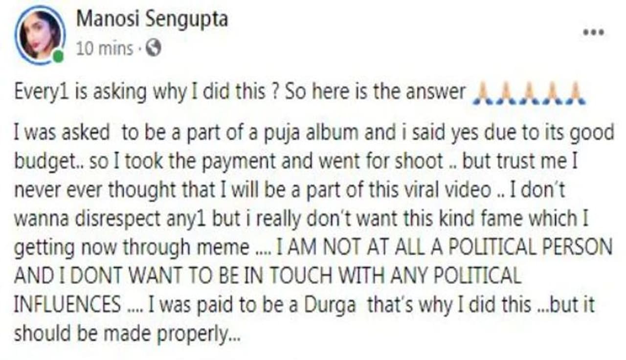 সোশ্যাল মিডিয়ায় এই ভিডিও নিয়েও ক্ষোভ উগরে দেন মানসী। তিনি লেখেন, "অনেকেই জিজ্ঞাসা করছেন যে কেন আমি এটা করলাম? এটা হল তার উত্তর। আমাকে বলা হয়েছিল পুজোর অ্যালবামের জন্য একটা কাজ করতে। আমি হ্যাঁ বলেছিলাম কারণ ভালো পারিশ্রমিক দেওয়া হয়েছিল...তাই আমি পারিশ্রমিক নিয়ে শুটিং শুরু করেছিলাম...কিন্তু বিশ্বাস করুন কখনও ভাবিনি যে এই ভাইরাল ভিডিওর অংশ হত আমি...আমি কাউকে অসম্মান করতে চাই না কিন্তু এভাবে বিখ্যাত হতেও আমি চাইনি তার জন্য আমাকে নিয়ে মিম তৈরি করা হচ্ছে...আমি কোনও রাজনৈতিক মানুষ নই আর কোনওরকম রাজনৈতিক ইনফ্লুয়েন্সের মধ্যে আমি নিজেকে জড়াতেও চাই না...আমাকে দুর্গা হওয়ার জন্য টাকা দেওয়া হয়েছিল তাই আমি কাজটা করেছি...কিন্তু এটা সঠিকভাবে তৈরি করা উচিত ছিল...।"